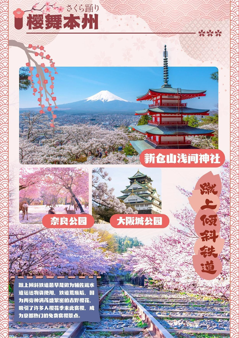 赏樱名所~【蹴上铁道】(约 40 分钟)蹴上倾斜铁道,这段已经废弃的铁道两侧樱花树夹道,是非常热门的赏樱地点, 当地人特别喜欢到这里漫步拍照,席地野餐。旧铁道的灰石路与粉色樱花相衬托,有着独特的美感。这段铁道当初的 兴建,是因为由大津到京都沿途,必须仰赖铁道来辅助水道运送物资,后来功用不再,反而成为现今的一道风景。