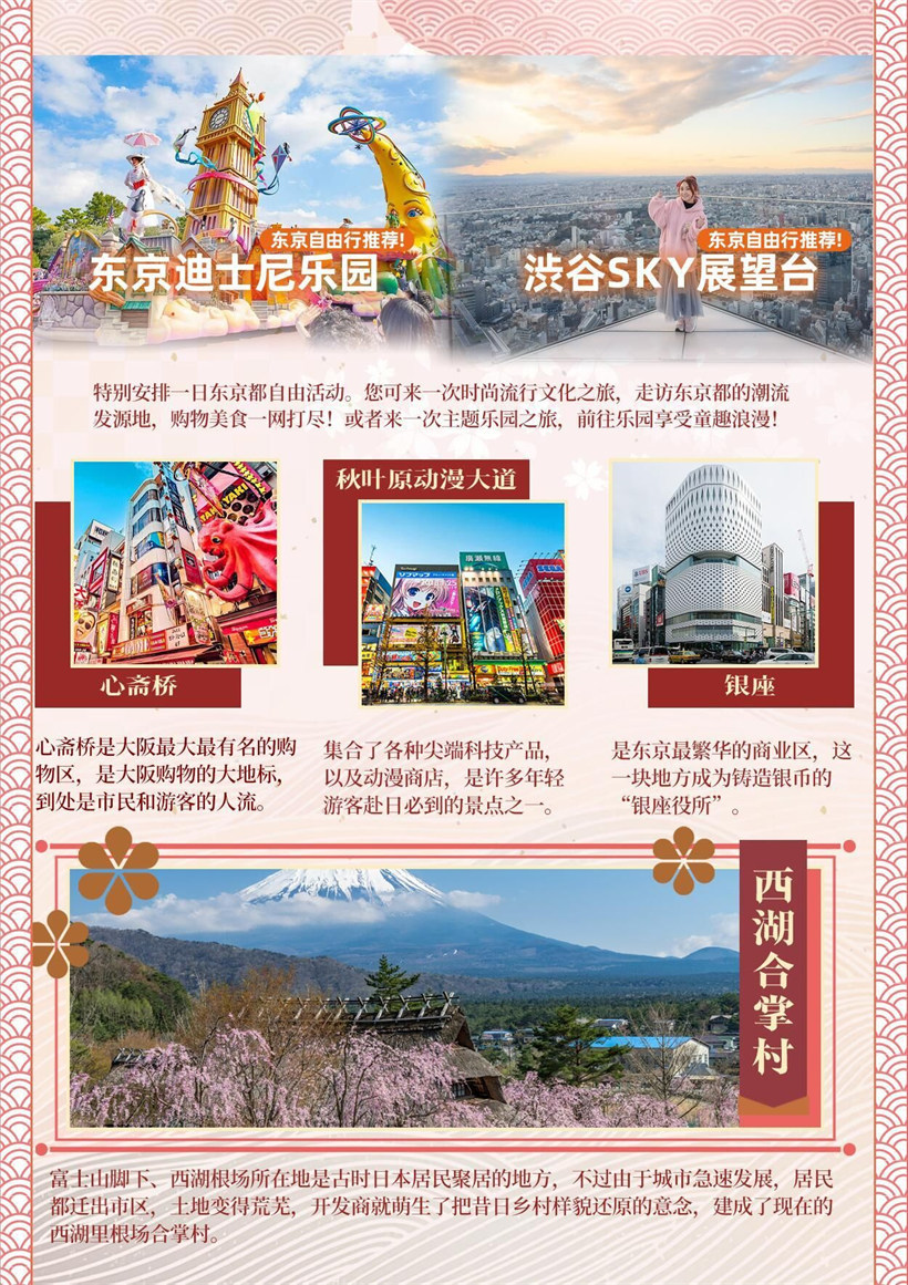 【西湖合掌村】(约 60 分钟)富士山脚下、西湖根场所在地是古时日本居民聚居的地方,不过由于城市急速发展,居 民都迁出市区,土地变得荒芜,开发商就萌生了把昔日乡村样貌还原的意念,建成了现在的西湖里根场合掌村。在此 眺望远方的富士山,仿佛近在咫尺。多栋屋舍用特殊的稻草编织起层层屋顶,特别是两边的屋顶像是一本打开的书一 样、成一个三角形状,可以减少受风力,且调节每日日照量,使得屋内得以冬暖夏凉,更适合人居住。在每栋建筑物 中,除了有传统工艺的体验外,还有资料馆、美食馆等可以游览参观。