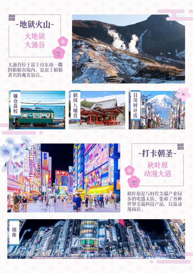 【富士芝樱公园】(约 60 分钟)(预计开催时间 4 月 15-6 月 10)富士山山麓的本栖湖附近,有芝樱的群生地,每年 会在开花时期举办「富士芝樱祭」。2.4 公顷的用地内,6 种约 80 万株以上的芝樱盛开,一整片渐层的粉红和富士山 的景致,美不胜收。 PS:樱花花期时间极其短暂,如遇天候因素(下雨、台风、气温)其凋谢或未绽开则改为忍野八海参观,请见谅!