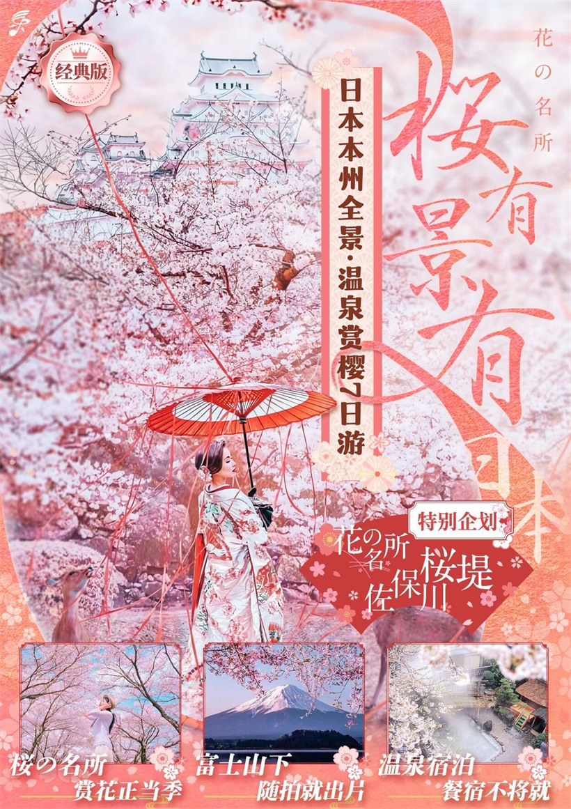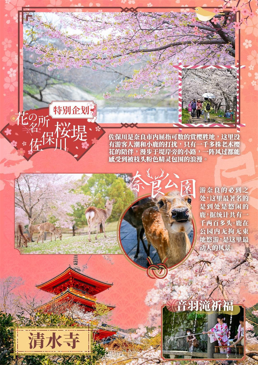 人气秘密景点-【佐保川樱堤】(约 30 分钟)河道两旁,种植了约 5 公里,1000 棵以上的樱花树,最高树龄超过 160 岁的老木樱花,是奈良市内屈指可数的赏樱胜地。亦被归在“奈良县景观资产”之列。这里没有游客人潮和小鹿的打 扰,只有一千多株老木樱花的陪伴,漫步于堤岸旁的小路,一阵风过都能感受到被枝头粉色精灵包围的浪漫。