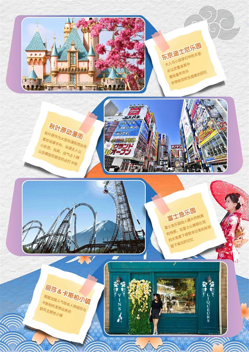 ◆东京迪士尼乐园:您与米奇、米妮、唐老鸭、维尼熊一同遨游探险乐园、明日世界、梦幻世界、动物天地等,有备注:行程景点先后顺序、用餐的内容及酒店图片设计仅为参考图片,实际以具体安排为准,尽请凉解! 灰姑娘的城堡、丛林巡航、巨雷山、鬼屋、小小世界、太空山、巴斯光年的星际历险等,老少咸宜的娱乐设施;而 午后时分,华丽的花车以及各个耳熟能详的卡通人物游行于街头大汇表演,必让您置身其中,重拾童年的欢乐;并 带给您终生甜美的回忆。晚上可观赏夜间千变万化的魅力游行或烟火雷射表演。地段各有自己的特点。面向年轻人 的时尚服饰店、快餐食品店和游艺中心等鳞次栉比的中心大道,作为年轻人时尚的发源地颇引人瞩目。无论白天还 是夜晚,这里总是聚集着大多为十几岁的年轻人,热闹的场面能让人深切地体会到现代日本的气息。 东京迪士尼乐园主要分为世界市集、探险乐园、西部乐园、动物天地、梦幻乐园、卡通城及明日乐园等 7 个区,园 内的舞台以及广场上定时会有各种各样的游行活动。 在迪士尼正门的中心,可以看到高耸的"灰姑娘城"这座主建 筑,在它的周围则建造了多种主题的游乐场和游乐馆,例如冒险宫、世界著名故事、传说宫、风景宫、闲游宫、宇 宙宫、幻想宫等。每一个游乐宫都配有详细的情节解说和音乐。乐园保持了美国迪士尼乐园的正宗风格,使人可以 体会到它的"非日常性的"演出特色。在东京迪士尼乐园里还可以看到大型的游行表演。 东京迪士尼乐园有五个主题乐园:维多利亚王朝时代式街景的世界市集、冒险和传奇的探险乐园、西部开拓时代的 西部乐园、梦境和童话的梦幻乐园、未来、科学和宇宙的明日乐园。这五大主题乐园中共有 35 项精彩的表演,其 共同特征是"一切都是活动的,有声有色的"。东京迪士尼乐园有七个主题区域:维多利亚王朝时代式街景的世界市 集、冒险和传奇的探险乐园、西部开拓时代的西部乐园、充分领略水上风光的动物天地、引人进入梦幻世界的梦幻 乐园、如置身童话王国的卡通城、体会未来的科学和宇宙的未来乐园。 这七大主题区域中共有 35 项精彩的表演,其共同特征是"一切都是活动的,有声有色的"。这里拥有神奇、新颖、 惊险、刺激的情景和人物场景设置。而使之成为可能的,是日本自己研制的"电子音响动作装置"。在这种装置的驱 动下,全园总数在 2000 个以上的人偶和动物足以达到以假乱真的程度,使人如身临其境