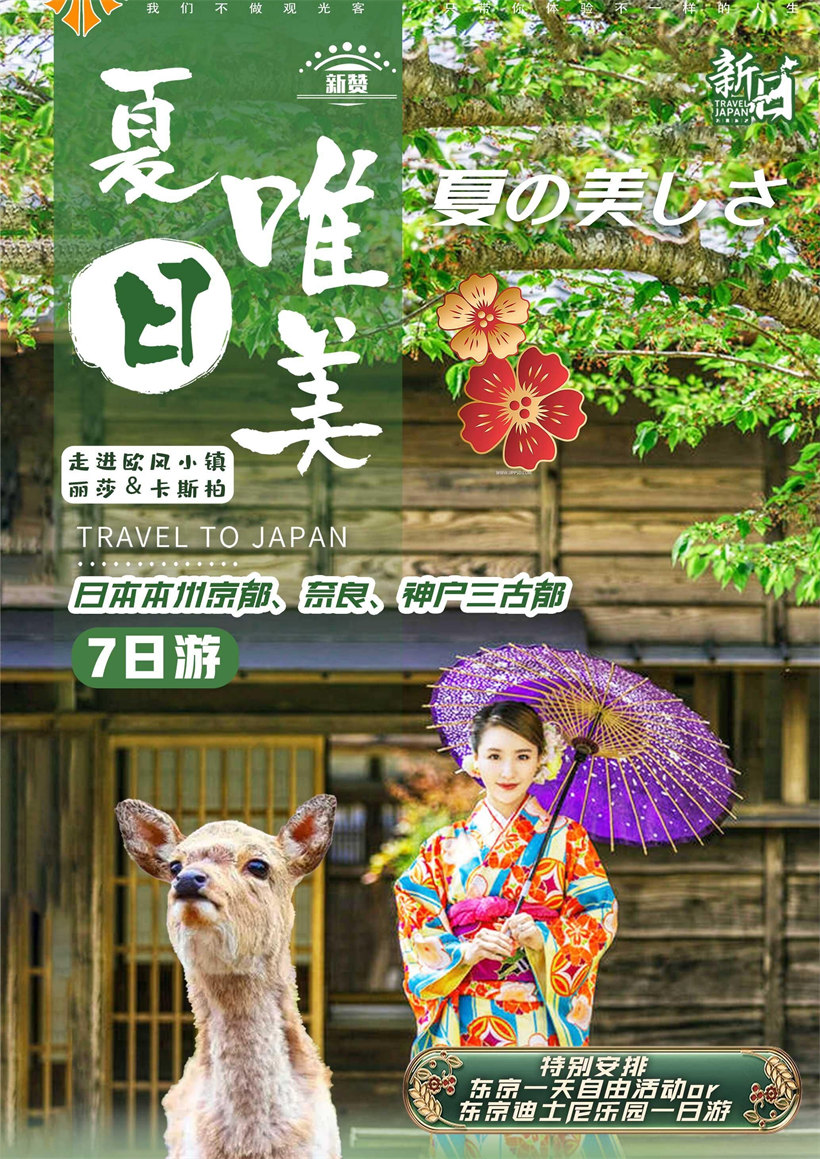 ★【奈良·神鹿公园】占地 5.25 平方公里,东西长约四公里,南北宽两公里,范围甚大,堪称是世界上数一数二 的大公园,公园内有很多名胜古迹巨树丛立,还有历史悠久的古花草、山林及岩石等,这些都让到日本旅游的游客 赞叹不已!奈良公园除了大片的绿地,最有名的象征是成群的鹿。传说,春日大社的神祇,就是乘着神鹿降临于此 地的。沿路都有梅花鹿可看,因为是开发的哦~可以抚摸也可以喂食~沿途都有小摊贩在卖【鹿仙贝】,只要你手边 有仙贝,它就会热情的追着你!可趁此时赶紧跟鹿拍张合照哦! ★【清水寺 二年坂、三年坂】世界文化遗产之木造千年古寺,参观寺内最著名的国宝「清水舞台」,建造在断涯 之上,是由 139 根立柱支撑架构而成,没有动用任何一根钉子,站在清水舞台,可以感受无比的震撼,清水寺的名 称则源于「音羽泷」,据说饮其水可治百病;供奉月下老人的「地主神社」,恋爱占卜闻名全国,想要祈求良缘的 人可别忘了试试姻缘石,据说只要闭着眼睛从石块的一方笔直走到另一边摸到石块,姻缘就会来临。而位于清水寺 前的二年坂、三年坂街道保留着古街的风貌,延路布满风情殊异的陶艺馆、古董店、茶馆等,边走边闲逛此街道, 既可购物、小憩、品茗,还有很多卖着仙贝、清水烧、抹茶冰淇淋的小店等,除了热情殷切免费试吃令人印象深刻 外,偶而还会看到打扮成艺妓的女子穿梭其间哦。 ★【祇园花见小路】讲到京都就会联想到衹园。在道路的两旁是纵横方向能通风的用细细的木材建成的格子窗,街 道的格调与舞妓的风采十分相称,街上排列着销售发簪、香和日式服装装饰物品等京都特有的商店。以北的马路巷 道中,有许多古老的木格窗建筑,多半是茶屋和料亭,洋溢京都江户时期的风味。黄昏时分,或可见外出献艺踩着 高高木屐的年轻舞伎、艺伎,小步急行的窈窕身影,更增添古都风情。花见小路是体验京都古代文化精华的必游之 处。 ★【观光公社】御宝真珠文化馆会定期举办日本珠宝文化节,加速与国际真珠专家的交流与合作。致力推广日本文 化,店内设有体验馆进行真珠养殖过程之讲述以及抽奖游戏。增添其开阔视野、增长见闻的旅游乐趣等。由于此批 发中心国际盛名,故很多商务人士及批发商前来访问参观