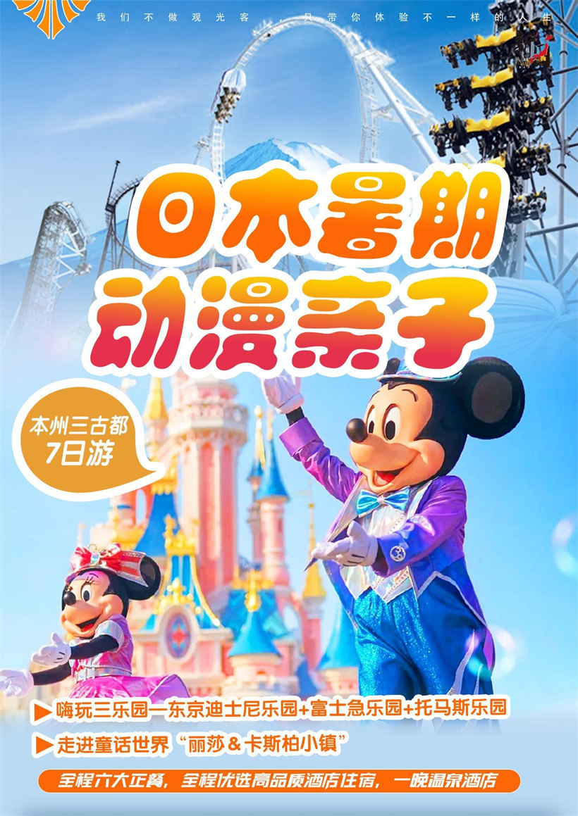 ◆东京迪士尼乐园:您与米奇、米妮、唐老鸭、维尼熊一同遨游探险乐园、明日世界、梦幻世界、动物天地等,有备注:行程景点先后顺序、用餐的内容及酒店图片设计仅为参考图片,实际以具体安排为准,尽请凉解! 灰姑娘的城堡、丛林巡航、巨雷山、鬼屋、小小世界、太空山、巴斯光年的星际历险等,老少咸宜的娱乐设施;而 午后时分,华丽的花车以及各个耳熟能详的卡通人物游行于街头大汇表演,必让您置身其中,重拾童年的欢乐;并 带给您终生甜美的回忆。晚上可观赏夜间千变万化的魅力游行或烟火雷射表演。地段各有自己的特点。面向年轻人 的时尚服饰店、快餐食品店和游艺中心等鳞次栉比的中心大道,作为年轻人时尚的发源地颇引人瞩目。无论白天还 是夜晚,这里总是聚集着大多为十几岁的年轻人,热闹的场面能让人深切地体会到现代日本的气息。 东京迪士尼乐园主要分为世界市集、探险乐园、西部乐园、动物天地、梦幻乐园、卡通城及明日乐园等 7 个区,园 内的舞台以及广场上定时会有各种各样的游行活动。 在迪士尼正门的中心,可以看到高耸的"灰姑娘城"这座主建 筑,在它的周围则建造了多种主题的游乐场和游乐馆,例如冒险宫、世界著名故事、传说宫、风景宫、闲游宫、宇 宙宫、幻想宫等。每一个游乐宫都配有详细的情节解说和音乐。乐园保持了美国迪士尼乐园的正宗风格,使人可以 体会到它的"非日常性的"演出特色。在东京迪士尼乐园里还可以看到大型的游行表演。 东京迪士尼乐园有五个主题乐园:维多利亚王朝时代式街景的世界市集、冒险和传奇的探险乐园、西部开拓时代的 西部乐园、梦境和童话的梦幻乐园、未来、科学和宇宙的明日乐园。这五大主题乐园中共有 35 项精彩的表演,其 共同特征是"一切都是活动的,有声有色的"。东京迪士尼乐园有七个主题区域:维多利亚王朝时代式街景的世界市 集、冒险和传奇的探险乐园、西部开拓时代的西部乐园、充分领略水上风光的动物天地、引人进入梦幻世界的梦幻 乐园、如置身童话王国的卡通城、体会未来的科学和宇宙的未来乐园。 这七大主题区域中共有 35 项精彩的表演,其共同特征是"一切都是活动的,有声有色的"。这里拥有神奇、新颖、 惊险、刺激的情景和人物场景设置。而使之成为可能的,是日本自己研制的"电子音响动作装置"。在这种装置的驱 动下,全园总数在 2000 个以上的人偶和动物足以达到以假乱真的程度,使人如身临其境