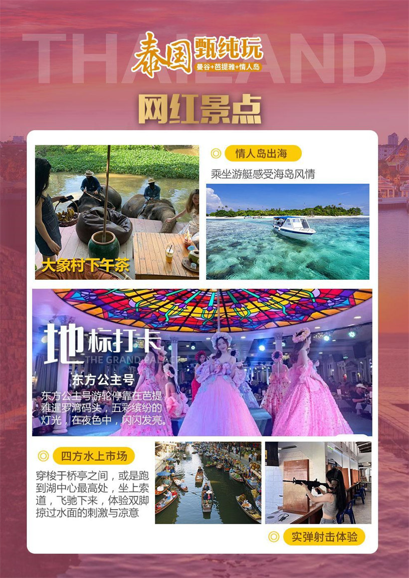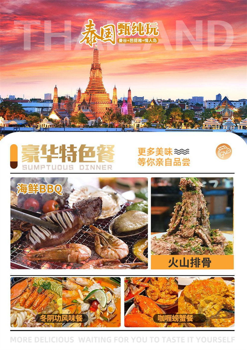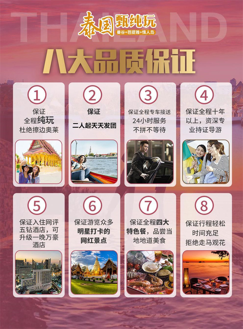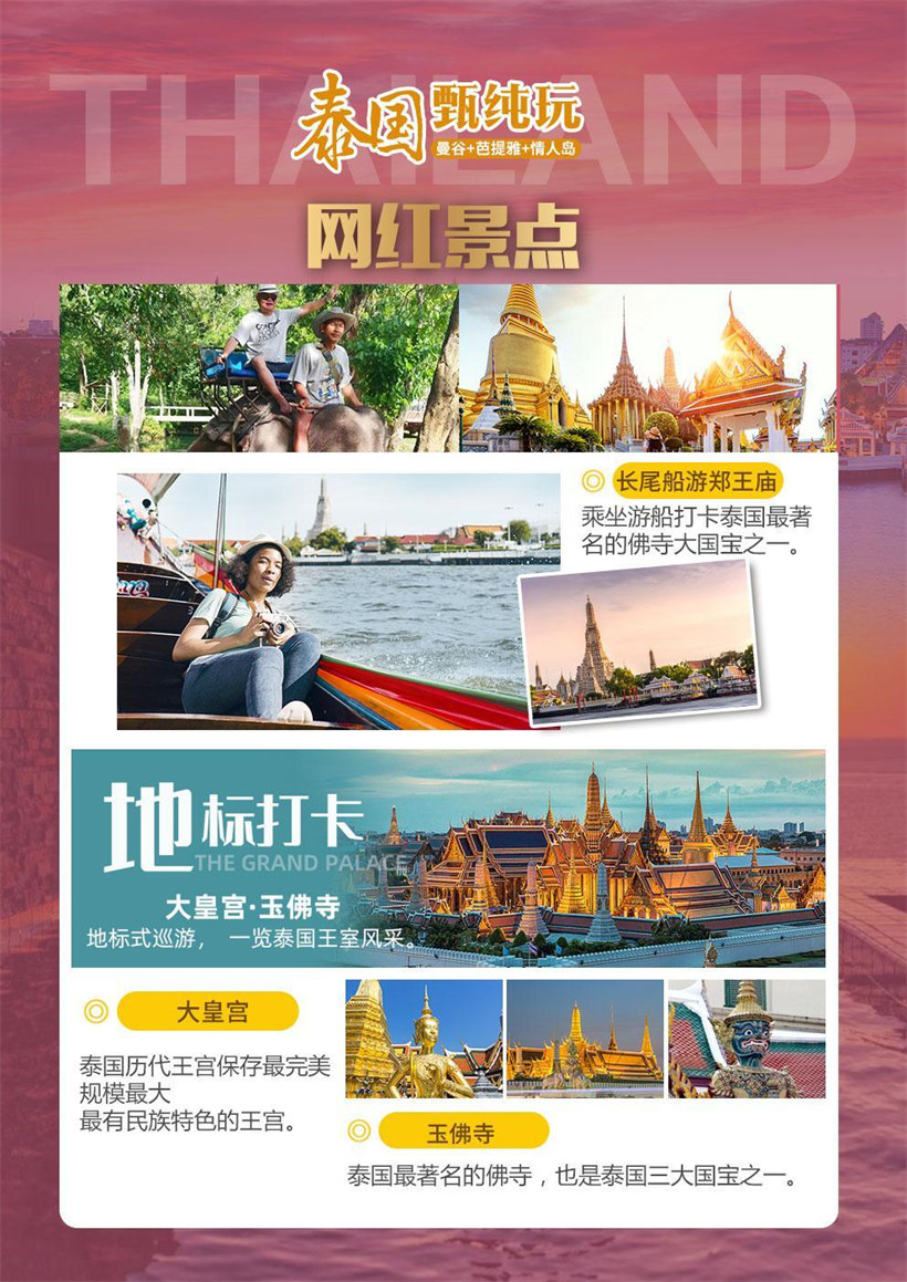 【玉佛寺】按泰国传统,泰王每年亲自为玉佛更换袈裟:热季换上镶红宝石的金衣,雨季穿着缀有蓝宝石的金 衣,而凉季则是一件纯金的金衣。 【长船游郑王庙】乘坐泰国古老的特色交通工具——长尾船,悠闲地欣赏河岸风光,观望郑王庙,郑王庙有一 座“拍攀”大佛塔,高 79 米,直插云霄,尖塔的外面装饰以复杂的雕刻,并镶嵌了各种彩色陶瓷片、玻璃和贝 壳等,是泰国规模最大的一座大乘塔,周围尚有四座与之呼应的陪塔,形成一组庞大、美丽的塔群,有着 “泰 国埃菲尔铁塔” 的美称,令人叹为观止。