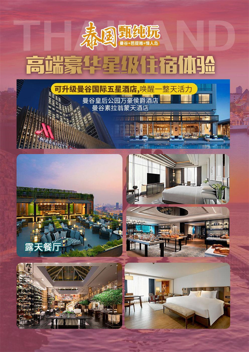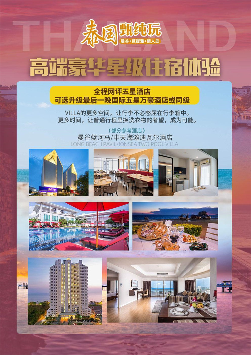 ►今日贵宾于国内乘国际航班飞抵“天使之城”-泰国首都曼谷(Bangkok),本社工作人员根据航班抵达时间与您接 洽并安排接机服务,随后乘车赴下榻酒店。