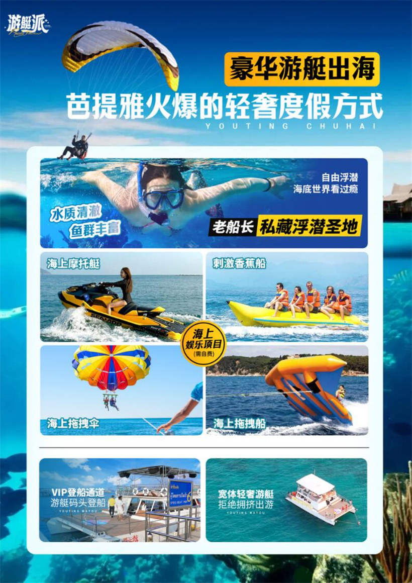 【独家愛之旅号游艇出海】乘游艇出海,已经成为芭提雅最火爆的度假休闲方式!这不仅是一种时尚,更是一种浪漫的轻奢体验。想象一下,在宽广的海洋上,你与亲朋好友一起,享受着海风的拂面,感受着海水的波动,仿佛整个世界都属于你们。【海钓】当鱼儿上钩的那一刻,船员给您新鲜制作刺身或者海鲜烧烤,在船上品尝与众不同的鲜味
