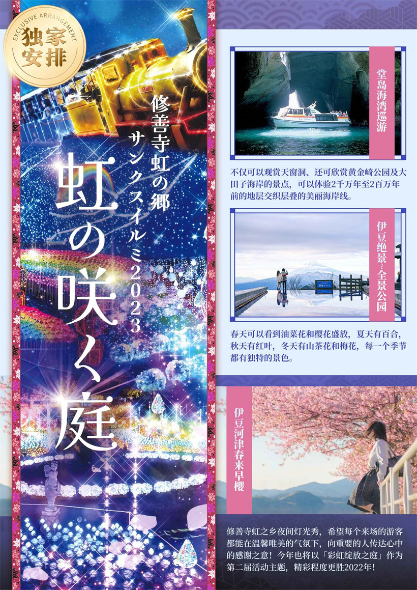 【伊豆河津春来早櫻】(约 50 分钟)它位于东伊豆半岛,由于伊豆半岛地理位置及气候和河津櫻花树品种配合下, 河津 櫻在每年二月早春之时多达 7000 棵河津櫻树开始绽放,因此当地每年 2/10-3/10 都会举办”河津櫻花祭”。