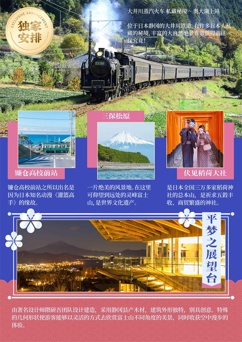 【大井川 SL 蒸汽火车-私藏秘境~奥大湖上站】(门票价值 1000 日元)(约 90 分钟)位于日本静冈的大井川铁道,有许 多日本人私藏的秘境,丰富的大自然绝景非常值得前往一探究竟!最引人注目的就是井川线有一座知名的秘境车站「奥 大井湖上站」,是一座伫立于湖上的无人车站,当列车行经日本唯一的湖上铁道「彩红铁道」时,做为湖中浮岛的衔 接车站。而当列车行经铁道,近距离欣赏两旁山林美景,浪漫氛围让人着迷。 Ps: 由于蒸汽火车每天限定班次,若时间不允许,未能搭乘则改为观光列车或退车资 1000 日元,敬请见谅!