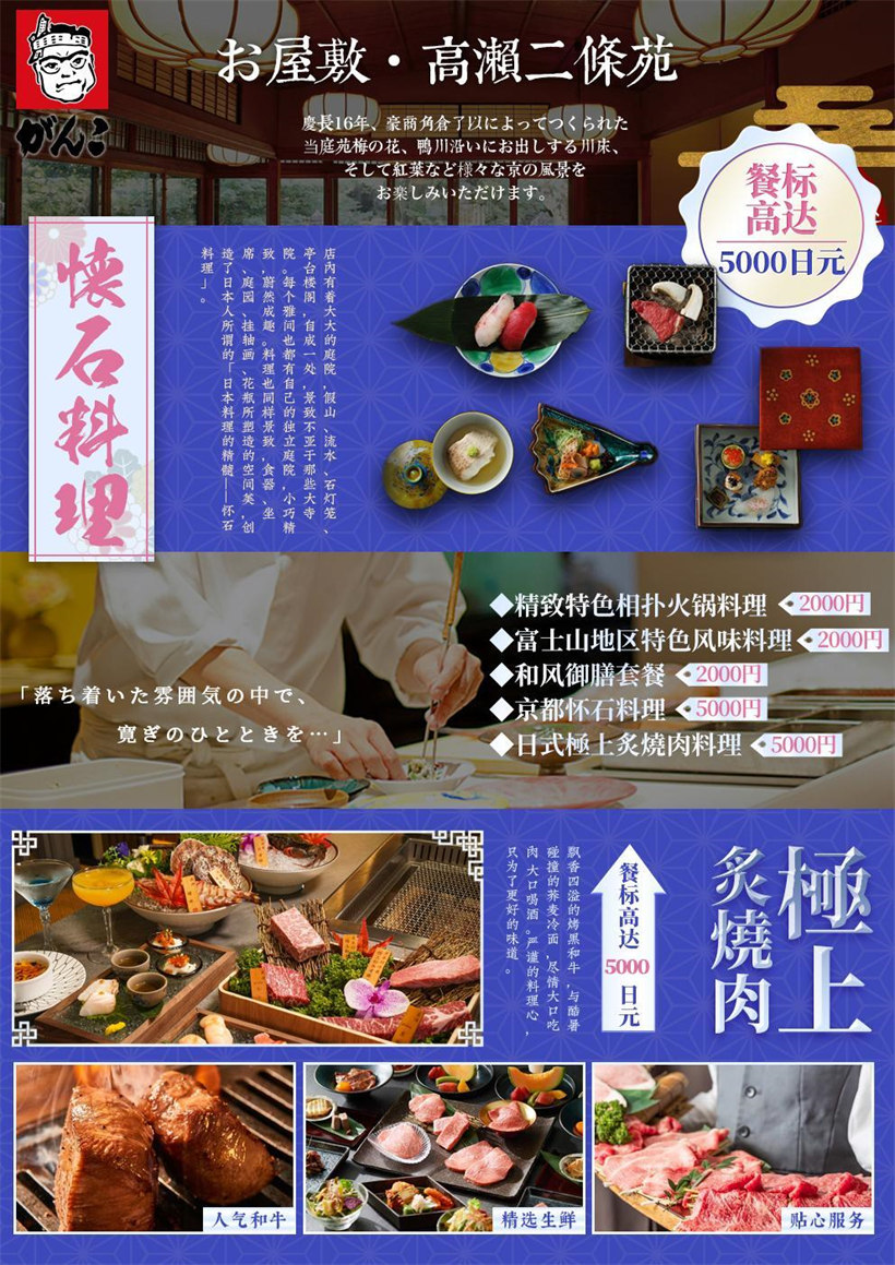 がんこ高濑川二条苑:京都市公所附近的一家非常有名的怀石料理店,餐厅建在一栋拥有百年历史的老屋中,餐厅是 典型的日式园林风格,精致,雅致