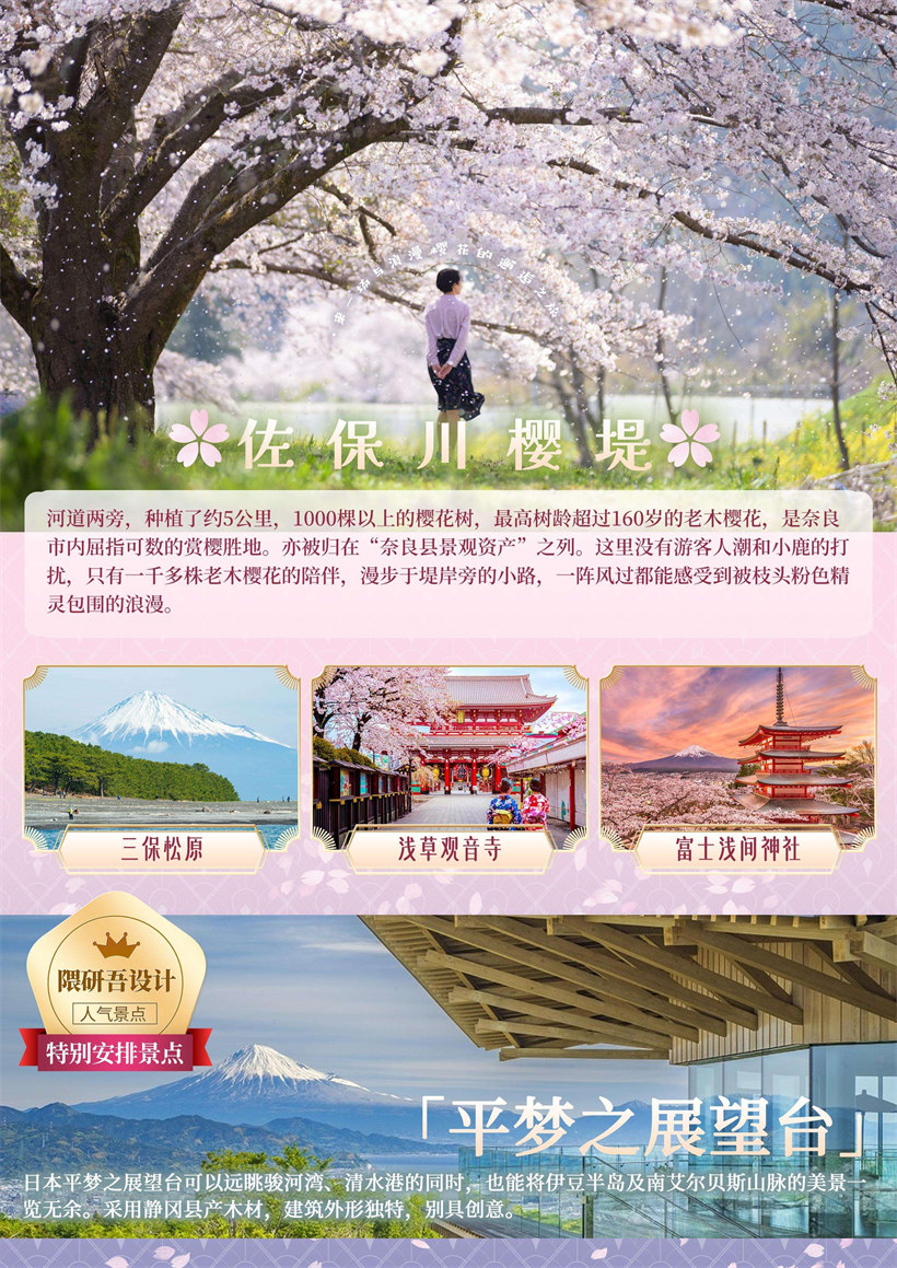人气秘密景点-【佐保川樱堤】(约 30 分钟)河道两旁,种植了约 5 公里,1000 棵以上的樱花树,最高树龄超过 160 岁的老木樱花,是奈良市内屈指可数的赏樱胜地。亦被归在“奈良县景观资产”之列。这里没有游客人潮和小鹿 的打扰,只有一千多株老木樱花的陪伴,漫步于堤岸旁的小路,一阵风过都能感受到被枝头粉色精灵包围的浪漫