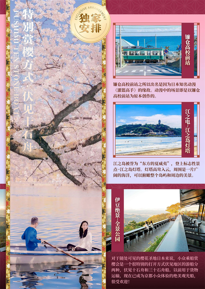 【特别赏樱方式~伏见十石舟】(约 60 分钟)(独家安排)对于随处可见的樱花圣地日本来说,小众乘船赏樱会是 一个很特别的打开方式伏见地区的游船分两种,伏见十石舟和三十石舟船。以前用于货物运输,现在已成为京都 小众体验的绝美观光船,很受欢迎!