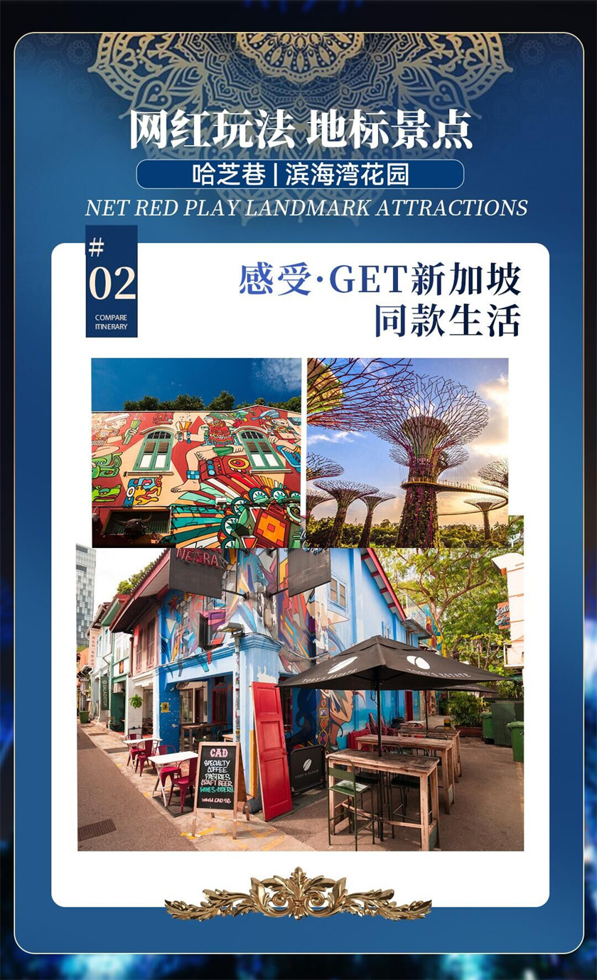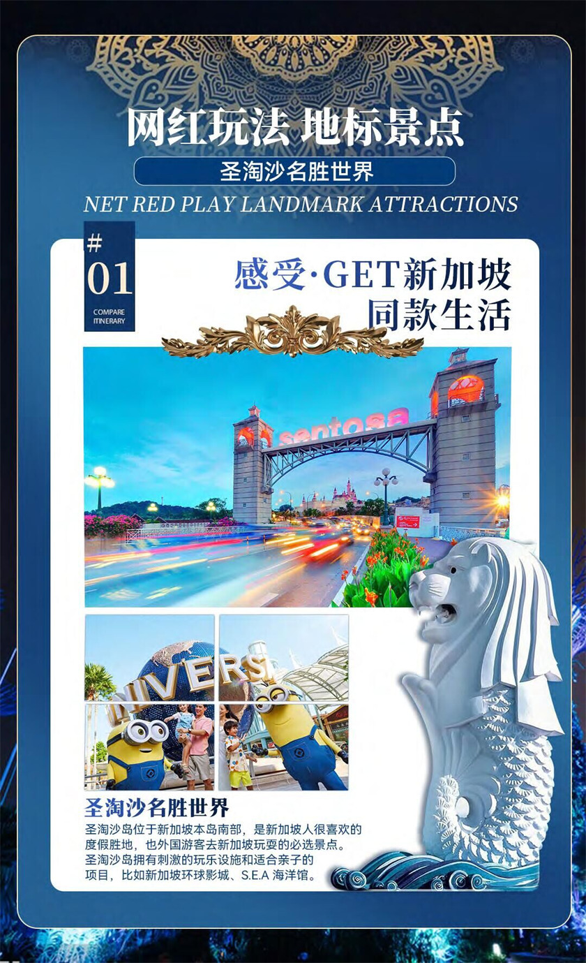 早餐后,前往新加坡河口海滨大道上的【鱼尾狮塑像】(约 30 分钟),这是新加坡的象征 和标志,并成为新加坡的国徽,赠送:网红冰淇淋品尝完,亦可远观【市政厅】【高等法院】和 【滨海艺术中心】(外观), 您可以找到最佳的角度拍照留念。然后移步前往【滨海湾花园】(室外 花园),滨海湾花园是新加坡市中心的超级花园,以 10 亿元造价成为新加坡最新的地标。拥有广大 绿地、林荫,和无数小花园与河流错落其中,远眺由擎天树、新加坡摩天轮、温室组成的绝美天际 线,享受眼前错落有致的风景,探索植物是如何与新加坡的文化错综复杂地联系在一起,前往新加 坡旅游绝对不能错过这里的美景!前往【甘榜格南】在 50、60年代曾是本地著名布品天堂。如今, 这里依然是优质丝绸、蜡染、饰带、透明硬纱等特色布材的集中地,而且,贴心的店家还提供定制和 裁缝服务。阿拉伯街上拥有悠久的纺织品贸易传统,在这种优越的基础上崛起了一条令人惊叹的精 品生活小巷--【哈芝巷】。在苏丹清真寺后方的小巷里,两排重新修缮的战前店屋中,拥有 20 多家 本地设计师品牌、新兴时尚精品店和稀奇小店,狭窄的街道却拥有宽阔的创意空间,每一栋房子都 被刷成了糖果色,店主们也充分利用自己的空间,在门上,柱子上画各种可爱随意的图案。独一无 二和这种自由原创的热情活力以及缤纷特色的建筑群,是哈芝巷最让人无法抗拒的吸引力,下午乘 车前往圣淘沙岛,【圣淘沙名胜世界】距离新加坡本岛仅半公里,由一座堤道跨海大桥与本岛连接 起来。小岛延续了 新加坡“花园城市”的味道,放眼望去,一片郁郁葱葱游客可以在沙滩上沐浴海 风,可以登山眺望 ,可以探索神秘的自然世界,也可以享受奇妙的感官刺激。为方便游览,游玩结 束后,自行乘车返回酒店哟。 推荐景点: 【环球影城】(门票本社可代定)大部分景点为世界级的首创亮点或是特地为新加坡量身定造的。 环球影城24 个景点和云霄飞车等项目中,有 18 个专为新加坡设计,全球独有的游乐项目,包括科 幻影集太空堡垒(Battlestar Galactica)为蓝本,高度达 42.5 米的双轨云霄飞车;以及拥有 3500 个 观众席、全球最多座位的未来水世界剧场等,拥有古埃及、失落的世界和好莱坞大道等七个主题 区,其中包括深具创意和世界最高的双轨过山车,一人坐着另一人悬挂,设计了突如其来的扭转出 其不意的快速下坠、及贴身交叉交错等令人窒息的变化,绝对引发嘶喊尖叫。主题公园内还有恐 龙、狐猴、可爱怪物以及埃及木乃伊等,为整个探险添加无数的惊险和刺激。