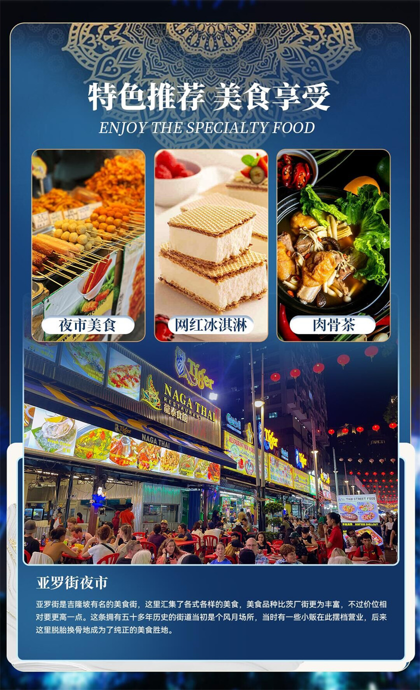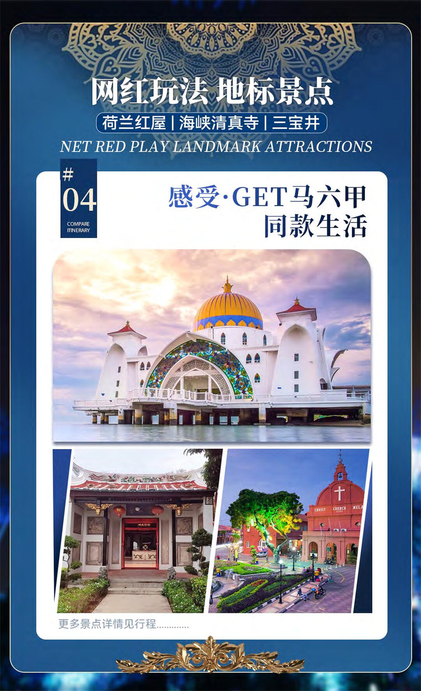 早餐后,马六甲市区游览【三宝井、三宝庙】为郑和下南洋遗留之古迹,及对马六甲王朝及东 西文化交流的影响。【荷兰红屋广场】,以荷兰砖瓦砌工及木工技艺建成的建筑,正是当时的荷兰 总督及随从的官邸,也是历史遗留下来重要的遗迹,被认为是东方最古老的荷兰建筑。 红屋旁边有 天主教堂【圣保罗教堂】这座由法国传教士在 1849 年建立的哥德塔式教堂,是为了纪念被誉为东 方之使徒的「圣芳济」,在 16 世纪为天主教传入东南亚做出重大贡献而建。还可以观赏【女皇钟 楼】【炮台】等建筑,随后前往参观【马六甲海峡清真寺】(含门票)这里位于人工修筑的马 六甲岛上。如果水位高,它看起来像一座浮动的建筑。落日余晖下的海峡清真寺很美丽,广播里传 出的诵经声与海浪声相互交织,夕阳西下映衬着金色的穹顶,坐在海边的堤坝上欣赏这一美景是件 很惬意的事。体验【马六甲游船】(含门票)感受来自大自然的魅力。游船结束后,前往参观 未来环保无烟城市-【太子城】。生临其境感受马来亚政府如何不花一分钱而能够在森林开发区建 出的未来马国行政电子中心。周边筑有皇宫、【首相府】、首相故宫、行政中心、财政部等等重要 的机构。除此以外还有坐落在湖上的粉红色【粉红水上清真寺】整座寺有四分之三建筑在布拉特湖 上,也被人们称为水上清真寺。因其顶部花岗石砌成的粉红色屋顶,视觉效果超棒,清真寺的设计 相当环保,祈祷大厅非常宽敞,柱子中心都是真空设计,天气炎热时可以从湖底马达运转抽风而上 入内,所以进入清真寺内时会有微凉的感觉,随后,前往吉隆坡市区,游览吉隆坡最新网红打卡地 【Saloma link】意为【和平桥】,它是市中心一座横跨巴生河,连结甘榜峇鲁及安邦路的行人天 桥,从这里步行到双峰塔只需大约15分钟,在这里您即可看到马来西亚地标【双峰塔】(外观), 随后前往【亚罗街夜市】亚罗街是吉隆坡有名的美食街,这里汇集了各式各样的美食,美食品种比 茨厂街更为丰富,不过价位相对要更高一点。这条拥有五十多年历史的街道当初是个风月场所,当 时有一些小贩在此摆档营业,后来这里脱胎换骨地成为了纯正的美食胜地