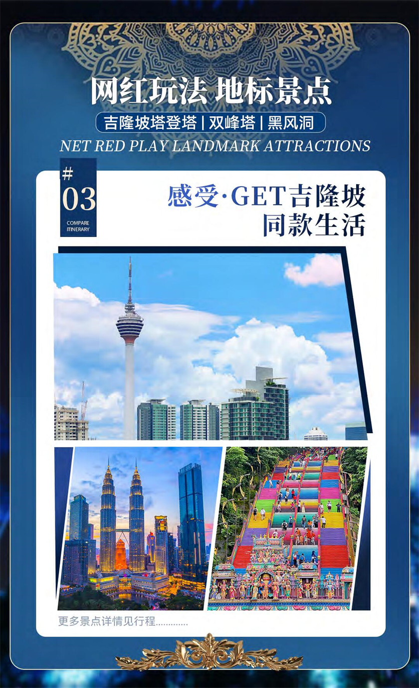 早餐后,前往吉隆坡塔,特别安排【吉隆坡塔登塔】(含门票)是鸟瞰大都会的好地 方。421公尺的塔高使它的海拔无形中增至515公尺,其实吉隆坡塔本是一座无线通讯塔,用来提升 无线通讯的质量以及广播传输的清晰度,游客可以在塔上的观景台和旋转餐厅俯瞰整个吉隆坡景。 随后来到【独立广场】位于皇家雪兰莪俱乐部旁的一片草坪,每一年的 8 月 31日,马来西亚公民 皆会齐聚在此,共同庆祝国家的独立。【高等法院大街】集中了伊斯兰代表性建筑,现在成了马来 西亚旅游的新象征;【英雄纪念碑】1966年,马来西亚于吉隆坡湖滨公园建造了国家英雄纪念碑。 【国家清真寺】位于吉隆坡市中心的国家清真寺,占地5.5公顷,于1965年建成,这是一组包括祈 祷大厅、大尖塔、陵墓和办公大楼的建筑群。结束后,驱车前往【黑风洞】距离吉隆坡商业中心大 约13公里,这座石灰岩洞穴每逢大宝森节时,皆会吸引大批旅客到此一游,广场上全是可爱的鸽子等你喂食,广场上有,身高43米的神像高大威武、金光灿灿。炯炯有神的目光凝视着远方,护佑人 间。雕塑身后是陡峭的272级【彩虹阶梯】,远处看来就像是从山洞延伸而出的一道彩虹,鲜艳抢 眼,使黑风洞从一个纯粹的宗教圣地变成了网红打卡地。随后前往【新山】,入住酒店,洗去疲惫。
