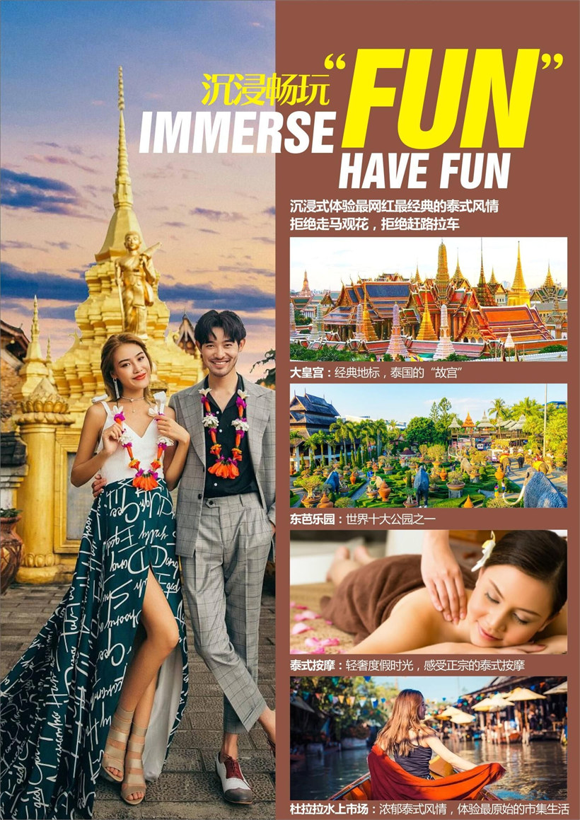 【杜拉拉水上市场】(40分钟左右)泰国的四合镇水乡独具当地的特色,这里生活的是水上民居,他们居住在泰 式木屋中,河道弯曲,,泛舟水上,感受曲折中的无限魅力。在河岸的边上,您会看到很多的设铺摆摊、这就是 我们所称为的位于水道中央的水上市场,这里琳琅满目,您在此可观赏到泰国传统的的民族舞,婉转的笙歌,独 特的场景,在这里还有很多小吃,色泽可谓五颜六色,绚丽缤纷,老板的叫卖声吸引顾客前去。