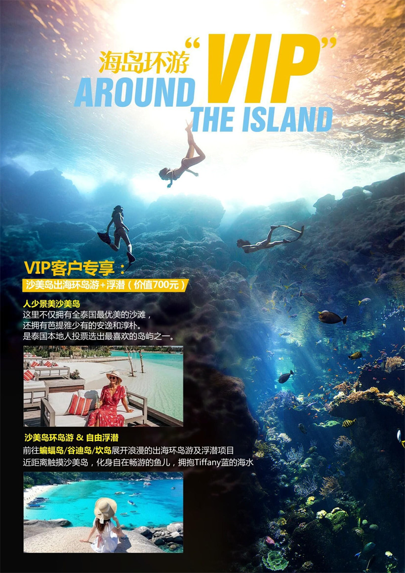 【出海环岛游 浮潜】【蝙蝠岛】【谷迪岛】【坎岛】展开浪漫的出海环岛游及浮潜项目,近距离触摸沙美岛, 让您的旅行不留遗憾。 温馨提示:特别提醒每位游客在乘坐快艇时,必须穿救生衣,听从导游安排,若不按规定乘坐,发生意外身体伤 害,旅行社只负责协助办理意外保险,旅行社将不承担任何责任。由于天气或者其他不可抗力因素导致无法出海 时导游会对当天行程进行临时调整近期进入泰国海上风浪大的季节,泰国水警发出警告:为了您的出行安全,60 岁以上客人不能过海,费用不予退还,谢谢理解。