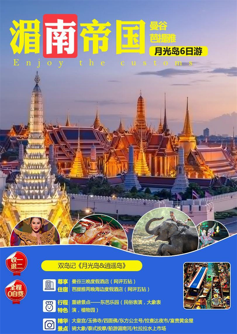 早餐后,前往金碧辉煌的【大皇宫】大皇宫是泰国诸多王宫之一,是历代王宫保存最完美、规模最大、最有民族特色的王宫。曼谷王朝从拉玛一世到拉玛八世,均居于大皇宫内。1946 年拉玛八世在宫中被刺之后,拉玛九世便搬至大皇宫东面新建的集拉达宫居住。现在,大皇宫除了用于举行加冕典礼、宫廷庆祝等仪式和活动外,平时对外开放,成为泰国著名的游览场所(不低于 1 小时)【玉佛寺】泰国玉佛寺位于曼谷大王宫的东北角,是泰国最著名的佛寺,也是泰国三大国宝之一。大皇宫与玉佛寺全景建于 1784 年的玉佛寺是泰国大王宫的一部分,面积约占大王宫的 1/4。玉佛寺是泰国王族供奉玉佛像和举行宗教仪式的场所,因寺内供奉着玉佛而得名。【船游湄南】,看看泰国人赖以为生、又名“妈妈的水”的湄南河。各色酒店、寺庙的灯火闪闪发光,浪漫不已,胜似泰晤士河两岸。接着观看泰国最正宗的人妖表演-【人妖秀】,从 VIP 视角享受这场雌雄莫辩的饕鬄盛宴!由于人妖天生的强烈表演欲,泰国人妖在历史上就是专为歌舞而培训,至今人妖歌舞秀已经到达巅峰,雌雄难辨、精彩纷呈的演出保证让您终身难忘。表演结束后,您还可近距离欣赏人妖,跟她们比一比到底是我美还是你艳,拍照留念可千万不能忘了(小费也别忘了)!『不低于 30 分钟』之后回酒店休息。备注:周一闭馆,改 72 府