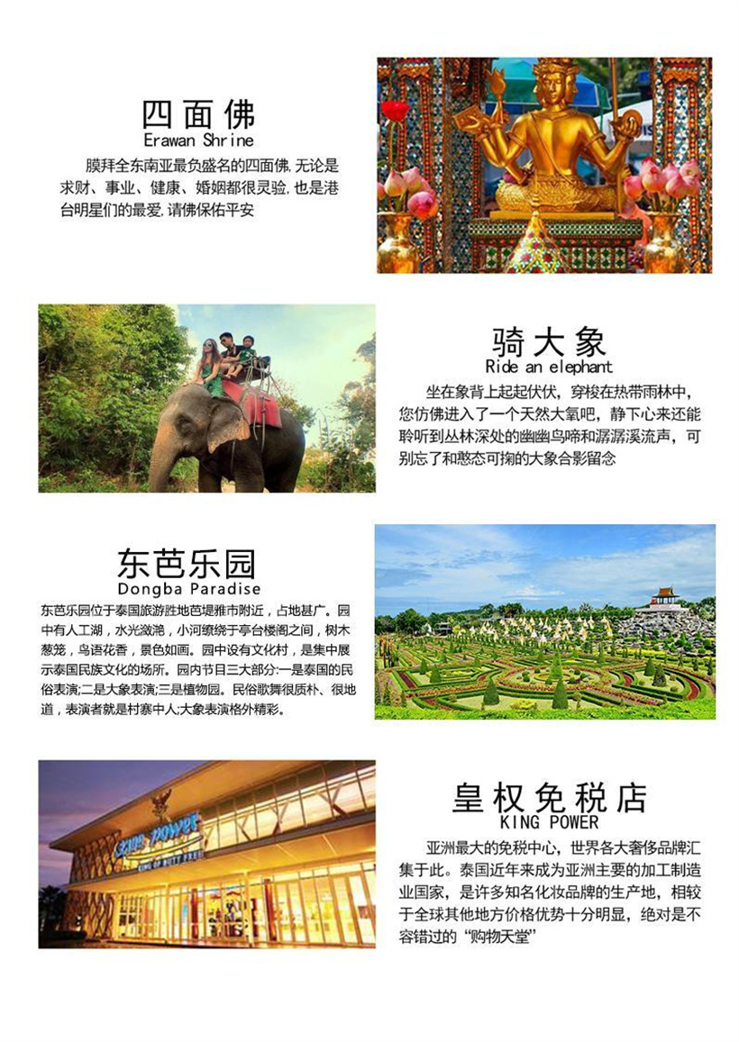 下午重点【骑大象】代步,森林田野象步悠悠享受泰国独特情调。【鳄鱼潭】可以在岸边买鳄鱼食喂鳄鱼,看鳄鱼在湖中自由游动。稍后团友们可以【坐马车】体验这种被遗忘的老式交通工具。『不低于 30 分钟』【杜拉拉水上市场】被称为“东方威尼斯水城”的水乡是电影《杜拉拉升职记》拍摄地,融合了浓郁纯朴的泰国乡村文化气息。一幢幢古色古香的木雕风格泰式房屋围建于蜿蜒的河道上而形成风情独特的水上人家。舢板船随着船夫划桨撩拨起水波在绿色的运河上穿梭前行,还能欣赏到沿岸的传统民俗舞蹈笙歌(游览时间不低于 40 分钟)。
