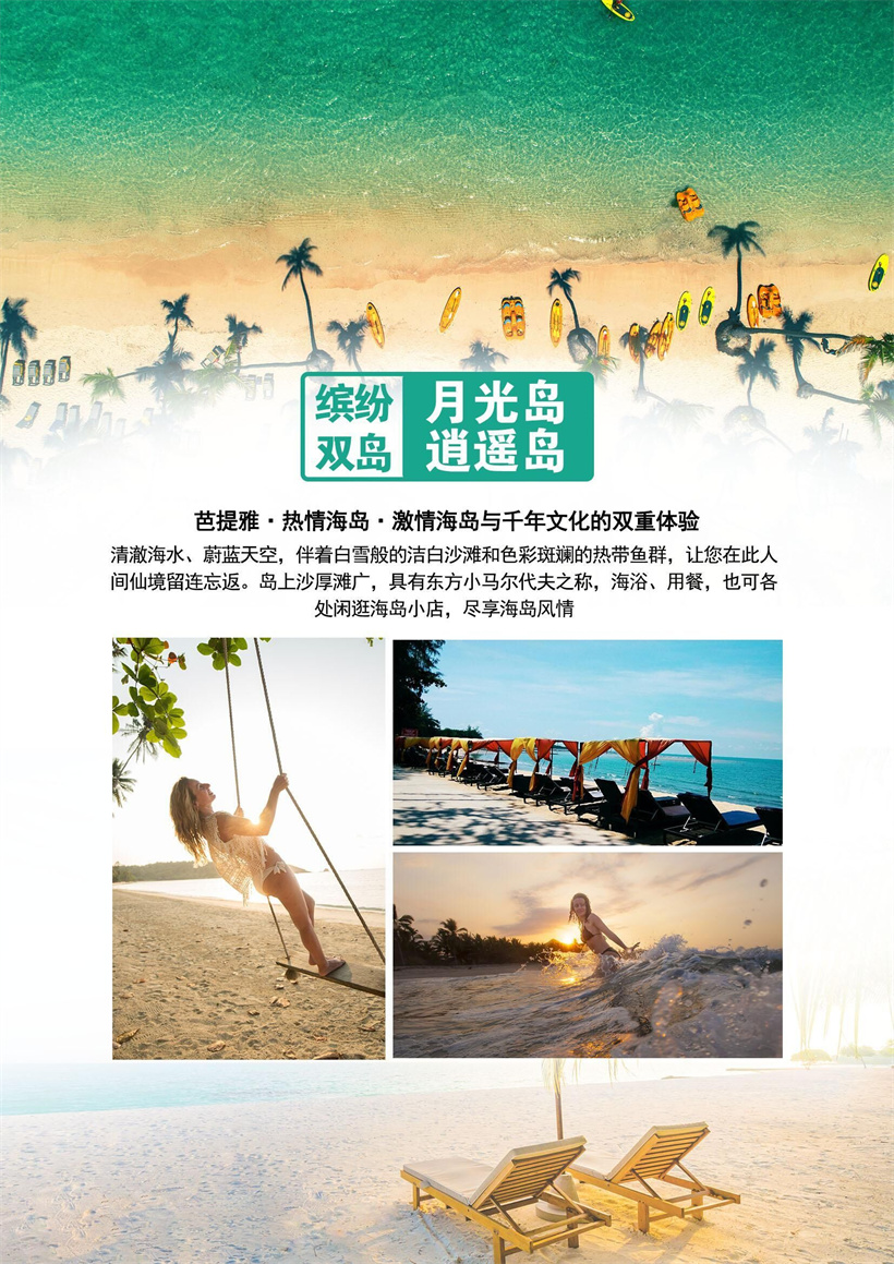 早餐后前往泰国芭提雅著名的海洋公园【月光岛】展开我们的精彩的月光岛漫步,抵达后月光岛后,您可以去租用一个沙滩躺椅,在此享受日光浴更可投身大海享受悠闲的海岛风光,放松自我、尽享这世外桃源带给您的温馨假期!