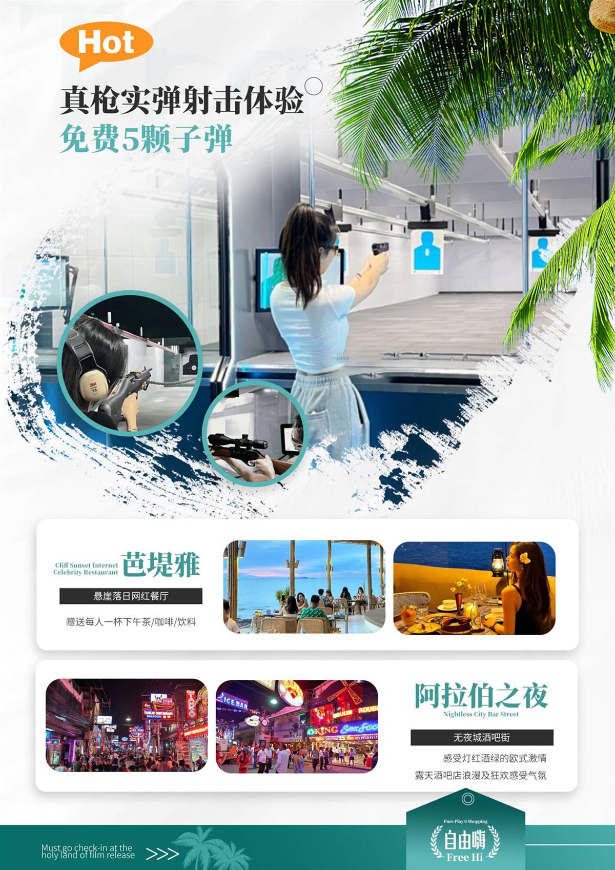 【真枪实弹射击体验】(免费赠送五颗子弹,另可以自费体验实弹射击,具体价格以现场为主,赠送项目不用不退)国内体验不到的实弹射击体验,玩转泰国最IN的娱乐方式。场馆内自由参观,感受真枪实弹带来的刺激。