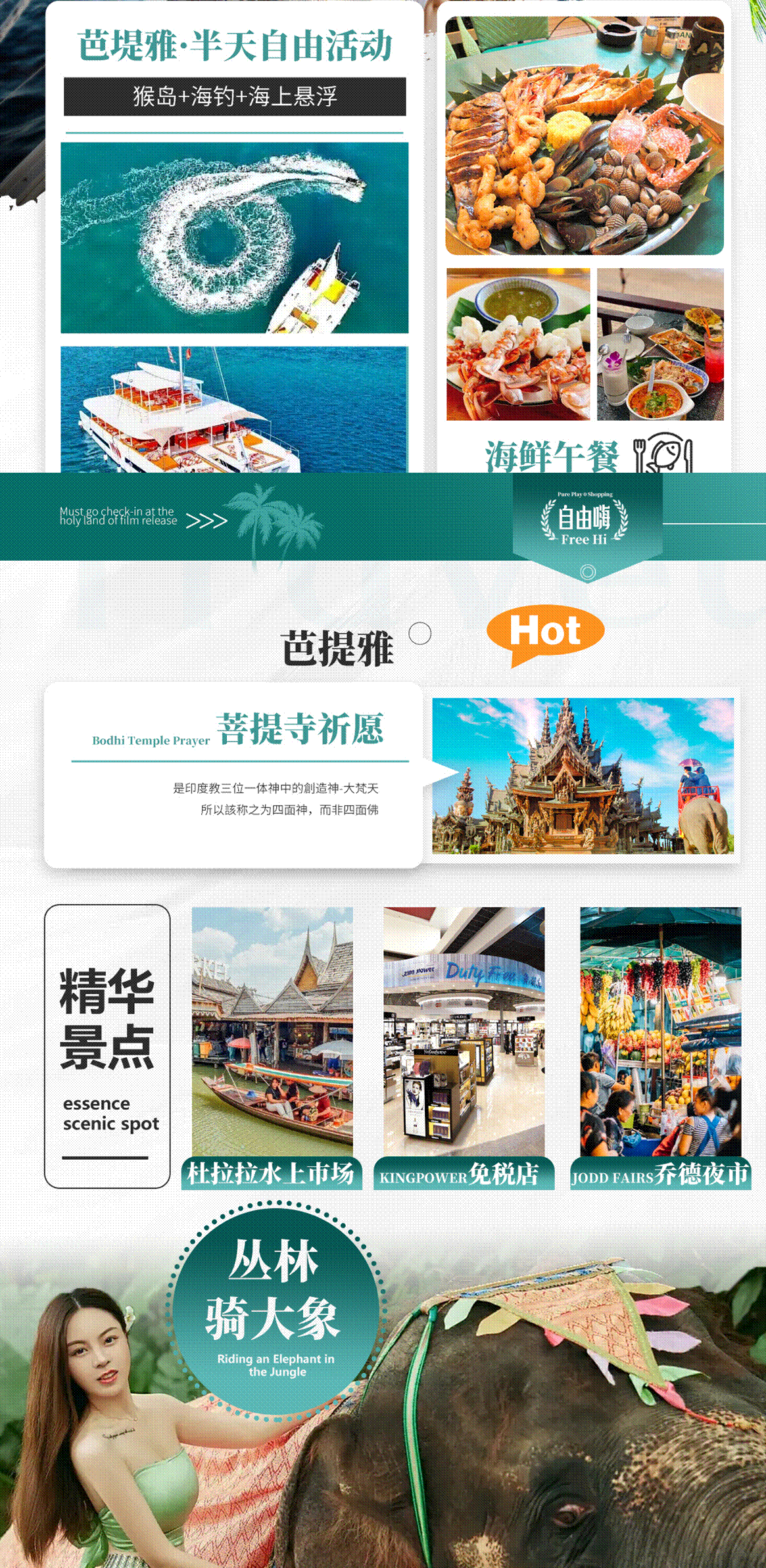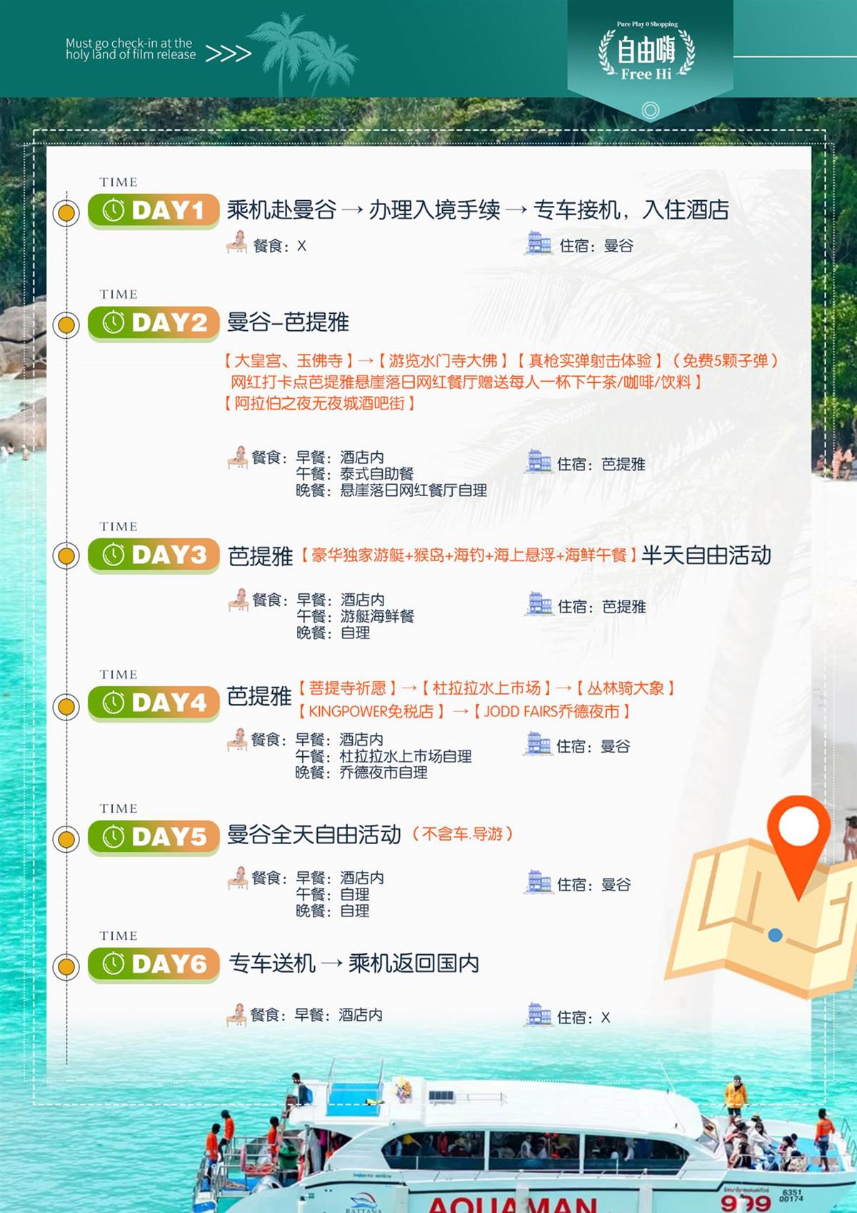 13 | 温馨提示:特别提醒每位游客在乘坐快艇时,必须穿救生衣,听从导游安排,若不按规定乘坐,发生意外身体伤害旅行社只负责协助办理意外保险,旅行社将不承担任何责任。由于天气或者其他不可抗力因素导致无法正常出海时,导游会对当天行程进行临时调整。为保证游客出行的安全,泰国水警发出警告:65岁以上客人不可以过海,上岛费不退。 |