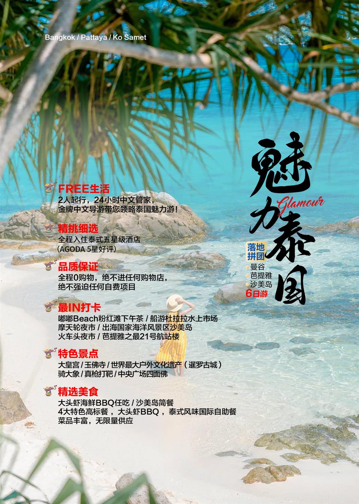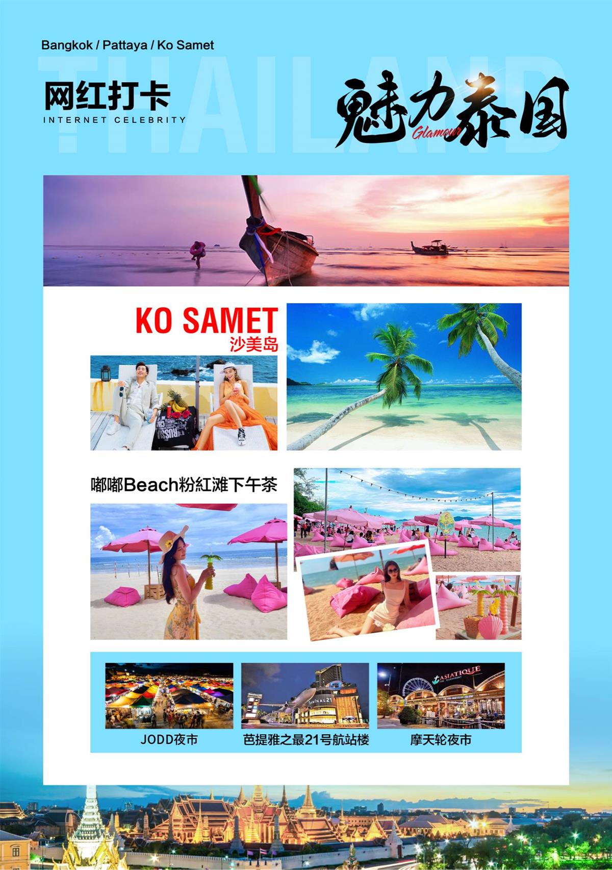 早餐后驱车前往位于罗永府的【沙美岛国家海洋自然保护风景区】(约180分钟)。抵达沙美岛后,您可信步于沙美岛细腻的沙滩上,您可在此享受日光浴更可投身大海享受悠闲的海岛风光,放松自我,尽享这世外桃源带给您的美好时光。【嘟嘟Beach粉紅滩下午茶】(约60分钟)每人+1杯飲料或1椰子、新晋网红打卡点,蓝天白云下,坐在粉红色沙滩垫上,面朝大海,享受海风,假装身在夏威夷,相信芭提雅芭应该没有比这里更新更适合打卡的下午场所了吧。【Terminal 21】(约60分钟)在泰国所有的商场里,最有特色的No.1要数 Terminal 21了,以机场航站楼为主题,逛商场像是到机场 check in 购物,除了在曼谷市区的Asok, 现在已经开到芭提雅,成为芭提雅最新城市坐标!先不说买买买,光是拍拍拍就让你停不下来!