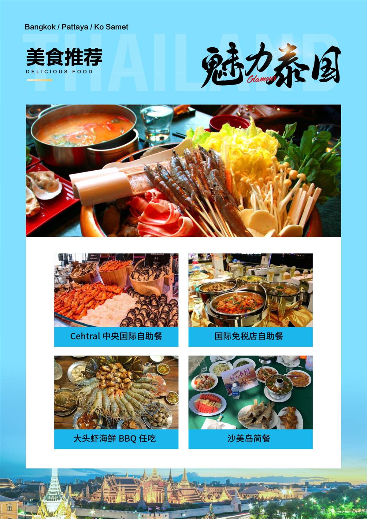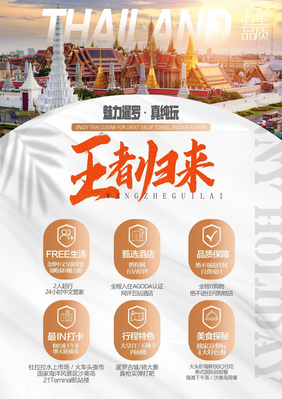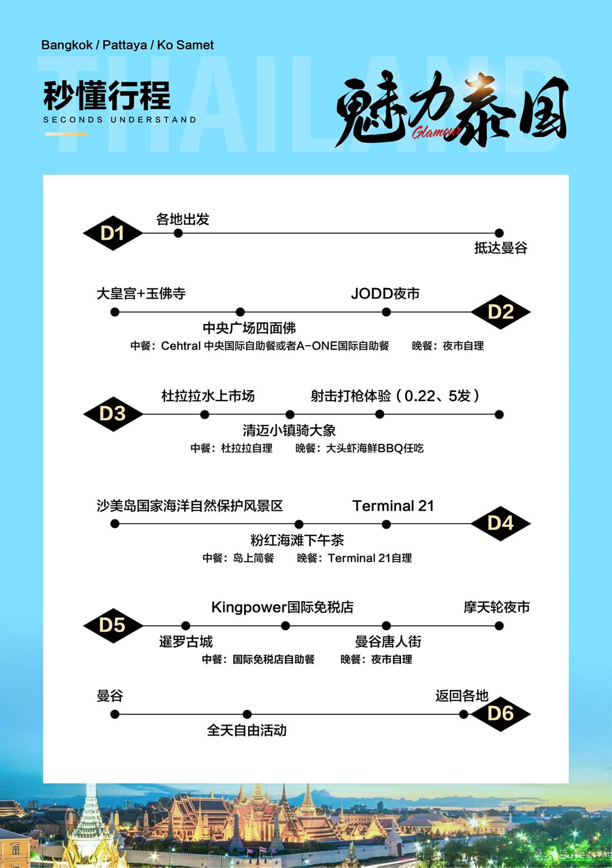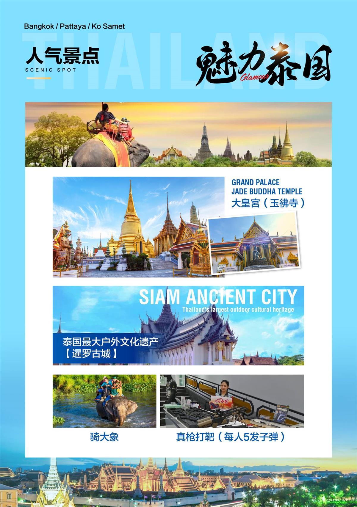 【暹罗古城】(约120 分钟)-千年暹罗古城一日-世界最大户外文化遗产博物园泰国九世皇御授国家级文化遗产,泰国九世皇携同英国伊丽莎白女皇御驾亲临主持开幕大典历经半个多世纪、耗资无法估量雕琢的文化瑰宝、永不竣工且不可复制的泰国奇观汇集经典网红、影视基地、佛教圣地、历史古迹、民俗文化、水上市集于一身。【KINGPOWER 皇权免税店】(约120分钟)曼谷最大的免税中心选购"雅诗兰黛"兰蔻""欧米茄""浪琴等世界国际名牌。【曼谷唐人街】(约120分钟)是位於泰國首都曼谷市西部的耀華力路唐人街是市區最繁華的商業區之一,同時也是曼谷最老的街區之一。【摩天轮夜市】(约120分钟)泰国曼谷的Asiatique河滨码头夜市,地点就位在昭皮耶河畔,这里的河畔码头夜景挺美丽的,而且一旁还有摩天轮,更增添了一份浪漫的气氛。