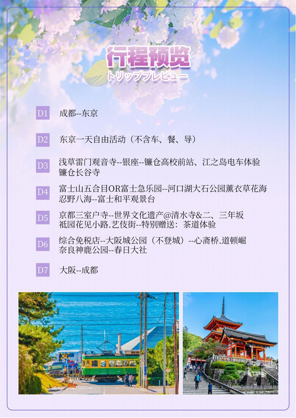 因花开放会随着季节气候变化,如遇气候因素(下雨、台风、气温)其凋谢或未绽开仍往原景点纯欣 赏,请见谅!)以上行程根据当地情况有所变更及调整,最终以出团通知为准!(行程中涉及的图片仅 限参考)