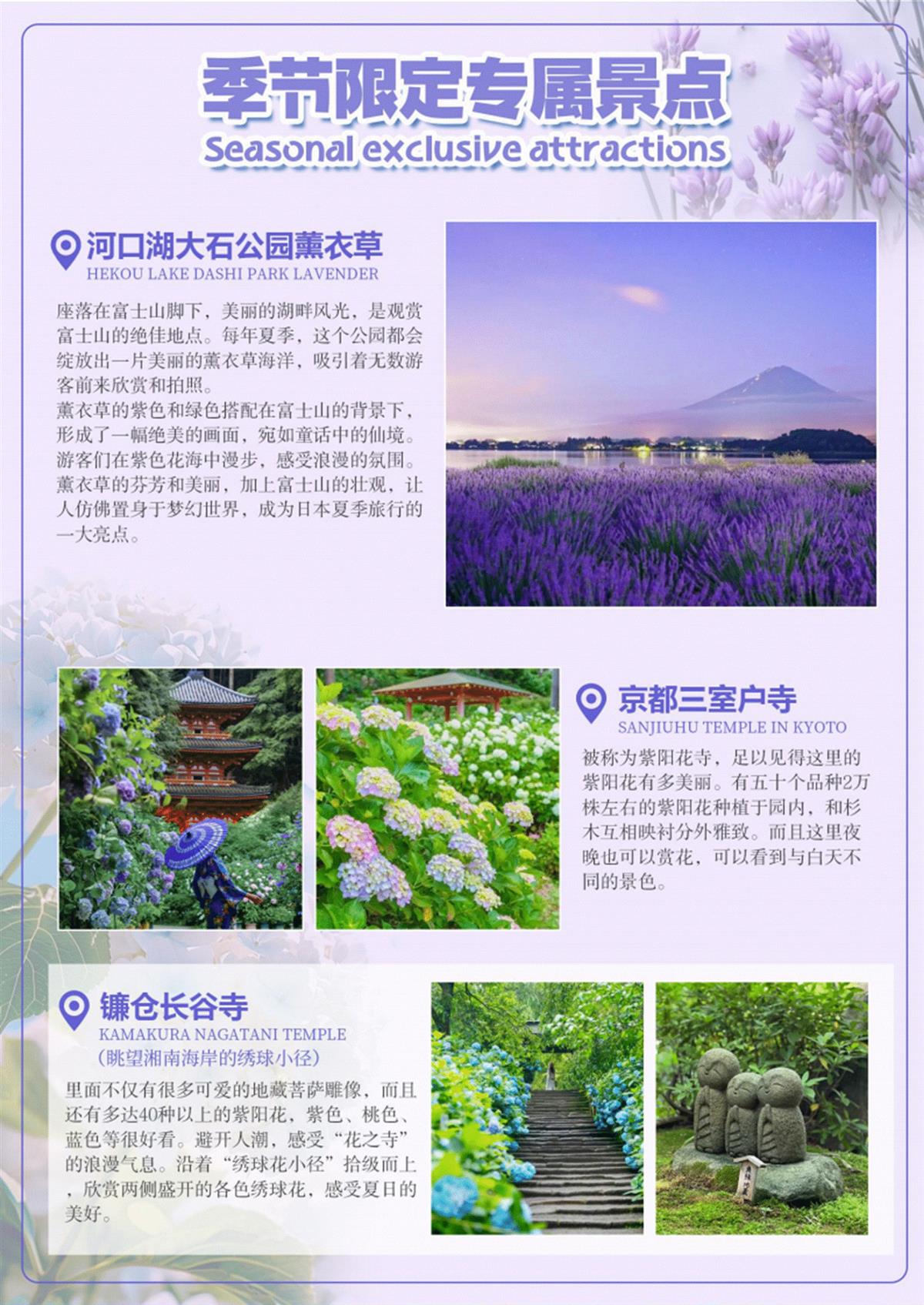 【河口湖大石公园薰衣草花海】座落在富士山脚下,美丽的湖畔风光,是观赏富士山的绝佳地点。每年夏季, 这个公园都会绽放出一片美丽的薰衣草海洋,吸引着无数游客前来欣赏和拍照。薰衣草的紫色和绿色搭配在富 士山的背景下,形成了一幅绝美的画面,宛如童话中的仙境。游客们在紫色花海中漫步,感受浪漫的氛围。