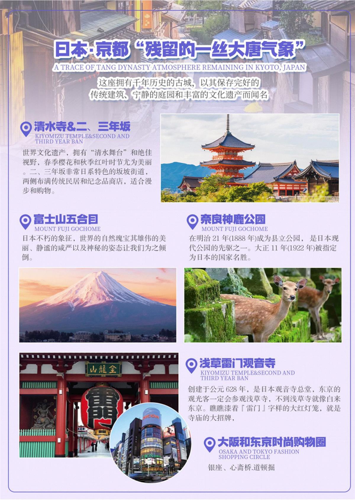 【清水寺+二年坂、三年坂】世界文化遗产之木造千年古寺,参观寺内最著名的国宝「清水舞台」,建造在断 涯之上,是由 139 根立柱支撑架构而成,没有动用任何一根钉子,站在清水舞台,可以感受无比的震撼,清水 寺的名称则源于「音羽泷」,据说饮其水可治百病;供奉月下老人的「地主神社」,恋爱占 卜闻名全国,想要 祈求良缘的人可别忘了试试姻缘石,据说只要闭着眼睛从石块的一方笔直走到另一边摸到石块,姻缘就会来临。 而位于清水寺前的二年坂、三年坂街道保留着古街的风貌,延路布满风情殊异的陶艺馆、古董店、茶馆等,边 走边闲逛此街道,既可购物、小憩、品茗,还有很多卖着仙贝、清水烧、抹茶冰淇淋的小店等,除了热情殷切 免费试吃令人印象深刻外,偶而还会看到打扮成艺妓的女子穿梭其间哦。(如遇旺季或节假日预约不到清水寺 停车场或景点限流,则景点更换为金阁寺)。