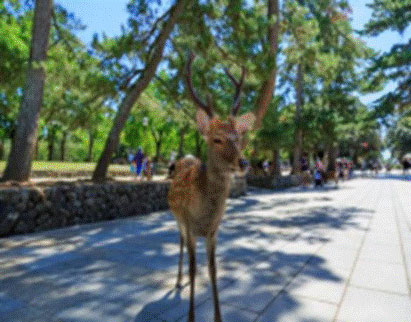 【奈良公园】(喂食小鹿,鹿粮不含)(约 60 分钟)位于奈良市街的东边,东西长4 公里、南北宽 2 公里, 面积广阔,若草山、东大寺、春日大社、国立博物馆等奈良的名胜古迹大多在这里。在明治 21年(1888 年)成 为县立公园,是日本现代公园的先驱之一。大正 11 年(1922 年)被指定为日本的国家名胜。成群嬉戏于公园里 的鹿,因与春日大社流传的白鹿传说有关而受到保护,且被指定为国家的自然保护动物。享受这美丽的大自然 最好是在碧绿的若草山和鹿毛色美的4、5 月,或是满山红叶的秋天等出游行乐、毕业旅行的季节。一年四季 无论何时,这里都有吸引人的景观。道路两旁,枫叶迎风招展,在和熙阳光的照耀下,如霞似火,发出悦耳的 飒飒声音,绿色的草萍上、道路上,铺满了从树上飘逸下来的五彩缤纷、形状各异的落叶,犹如一幅巨大的水 彩画,令人悦目舒心。据说奈良在近 1300 年前已建成平城京,后来日本首都迁往不远的京都再迁往东京,而 奈良竟不曾衰败过。秋天的奈良公园以大片鲜艳的红色,招呼着我们投进它的怀抱。走进林子,踩着红叶,邂 逅小鹿、行人、画家,还有属于世界遗产的东大寺,诉说日本秋天最浪漫的神话。其中有 1200 头鹿生活在这 里,这些鹿大多温顺而讨人喜爱。