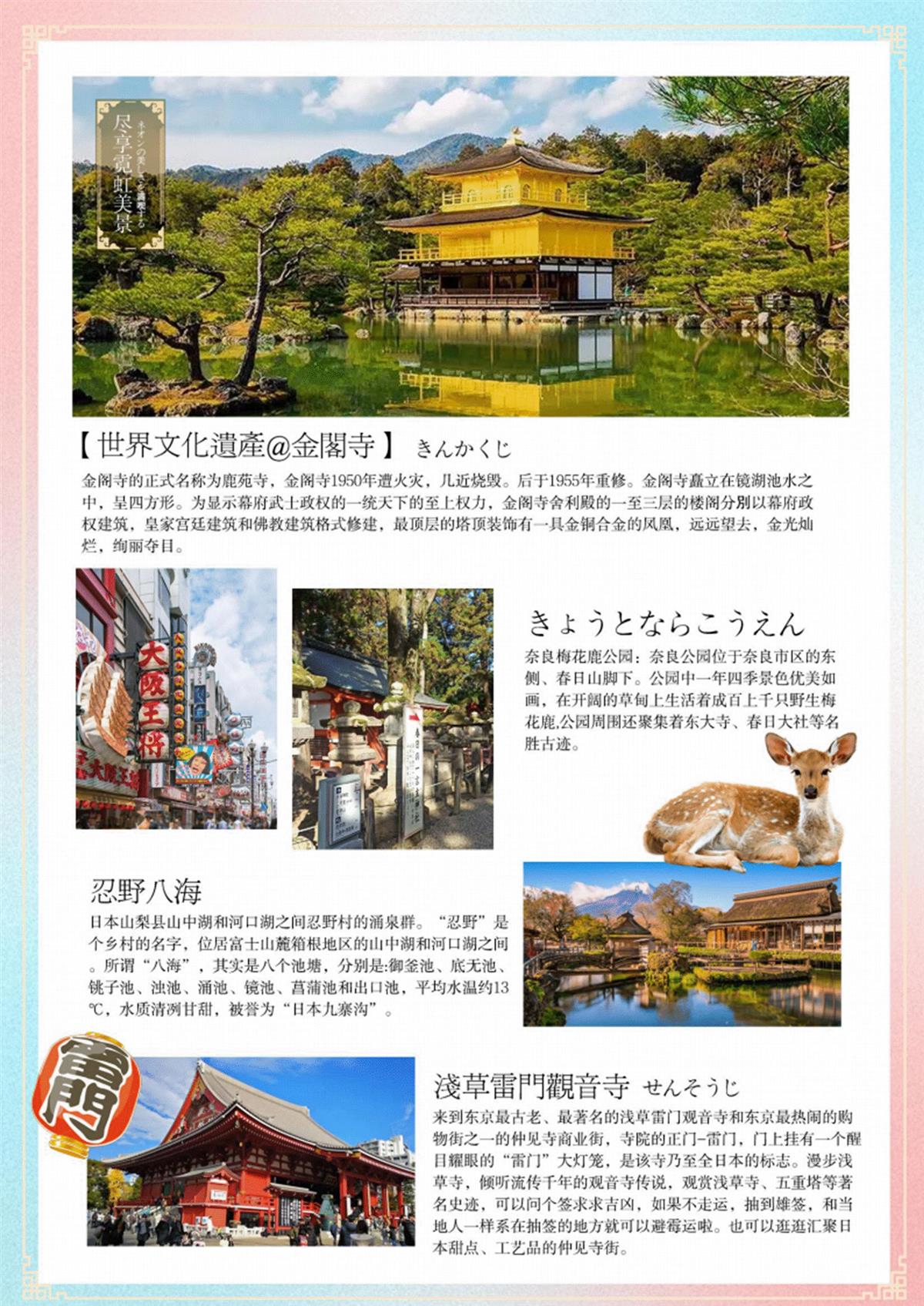 【奈良公园】(喂食小鹿,鹿粮不含)(约60 分钟)位于奈良市街的东边,东西长 4 公里、南北宽 2 公里,面积 广阔,若草山、东大寺、春日大社、国立博物馆等奈良的名胜古迹大多在这里。在明治 21年(1888 年)成为县立 公园,是日本现代公园的先驱之一。大正 11年(1922 年)被指定为日本的国家名胜。成群嬉戏于公园里的鹿,因 与春日大社流传的白鹿传说有关而受到保护,且被指定为国家的自然保护动物。享受这美丽的大自然最好是在碧 绿的若草山和鹿毛色美的4、5 月,或是满山红叶的秋天等出游行乐、毕业旅行的季节。一年四季无论何时,这里 都有吸引人的景观。道路两旁,枫叶迎风招展,在和熙阳光的照耀下,如霞似火,发出悦耳的飒飒声音,绿色的 草萍上、道路上,铺满了从树上飘逸下来的五彩缤纷、形状各异的落叶,犹如一幅巨大的水彩画,令人悦目舒心。 据说奈良在近 1300 年前已建成平城京,后来日本首都迁往不远的京都再迁往东京,而奈良竟不曾衰败过。秋天的 奈良公园以大片鲜艳的红色,招呼着我们投进它的怀抱。走进林子,踩着红叶,邂逅小鹿、行人、画家,还有属于世界遗产的东大寺,诉说日本秋天最浪漫的神话。其中有 1200 头鹿生活在这里,这些鹿大多温顺而讨人喜爱。 【金阁寺】(约 30 分钟)正式名称为鹿苑寺(Rokuon-ji),是京都最著名的景点之一。这座覆盖着金箔的三层享 阁不仅是京都最具辨识度的建筑,也是联合国教科文组织世界遗产的一部分。金阁寺的名字来源于其核心建筑-- 舍利殿,这座建筑的外墙全部以金箔装饰,因此得到了“金阁 ”的昵称。寺院始建于 1397 年,原为足利义满将 军(即动画《聪明的一休》中利将军的原型)的山庄。