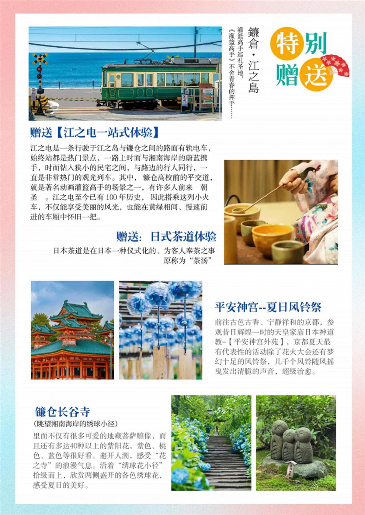 赠送【江之电一站式体验】江之电是一条行驶于江之岛与镰仓之间的路面有轨电车,始终站都是热门景点,一路 上时而与湘南海岸的蔚蓝携手,时而钻入狭小的民宅之间,与路边的行人同行,一直是非常热门的观光列车。其 中, 镰仓高校前的平交道,就是著名动画灌篮高手的场景之一,有许多人前来〝朝圣〞。江之电至今已有 100 年 历史, 因此搭乘这列小火车,不仅能享受美丽的风光,也能在黄绿相间、慢速前进的车厢中怀旧一把。