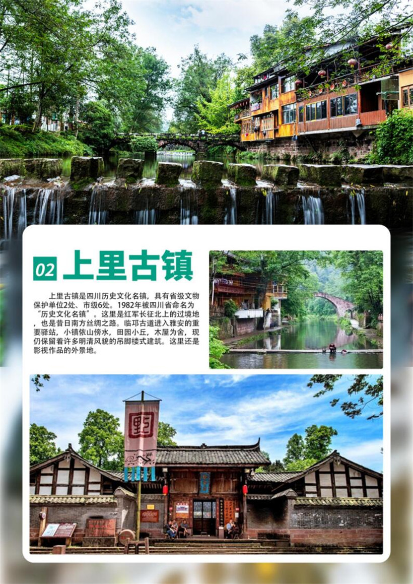 下午:游览:“四川十大古镇”之一的历史文化名镇——上里古镇,这里是红军长征北上的过境地。也是昔日南方丝绸之路,临邛古道进入雅安的重要驿站,小镇依山傍水,田园小丘,木屋为舍,现仍保留着许多明清风貌的吊脚楼式建筑。游客可游览上里古镇,二仙桥、老街等景点,徜徉在小桥流水的古镇上,感受小镇的民俗风情。带着愉快的心情返回成都,结束行程