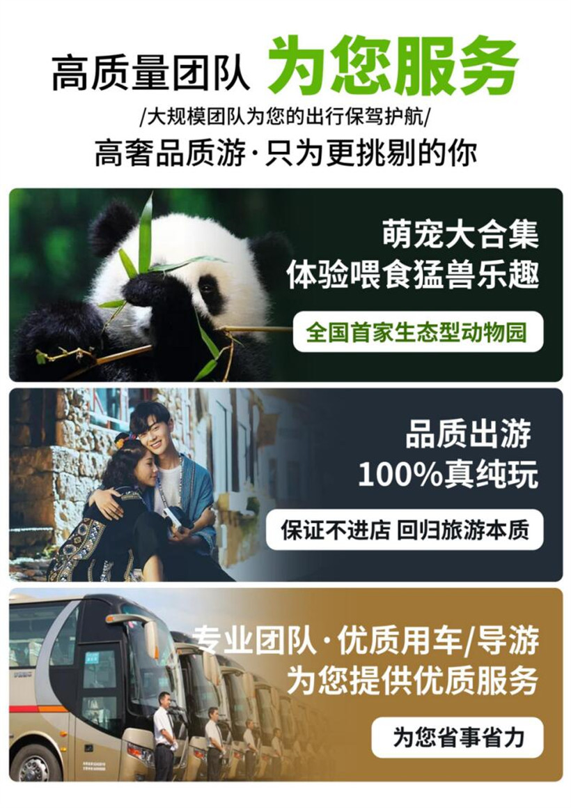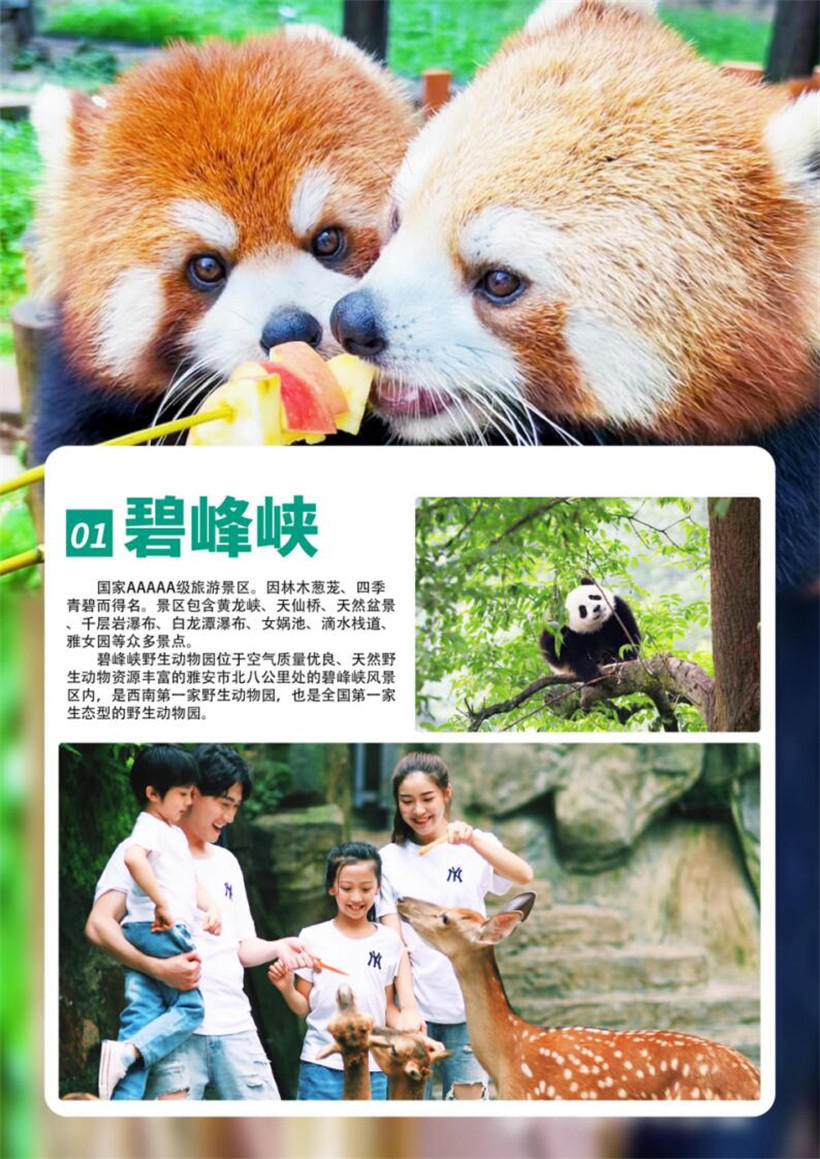 早上:早餐后,游览碧峰峡风景区,熊猫基地,观看可爱的国宝——大熊猫,后经景区栈道观河之洲、野鸭滩、金粉滩、天龙凌云、长寿山、白龙潭瀑布、悬棺、神鹰峰、十指补天峰、滴泪瀑布、千层岩瀑布等景色。一边享受“天府之肺”的清新空气,一边聆听女娲补天时留下的许多凄美动人传说。最后乘坐电梯出风景区。