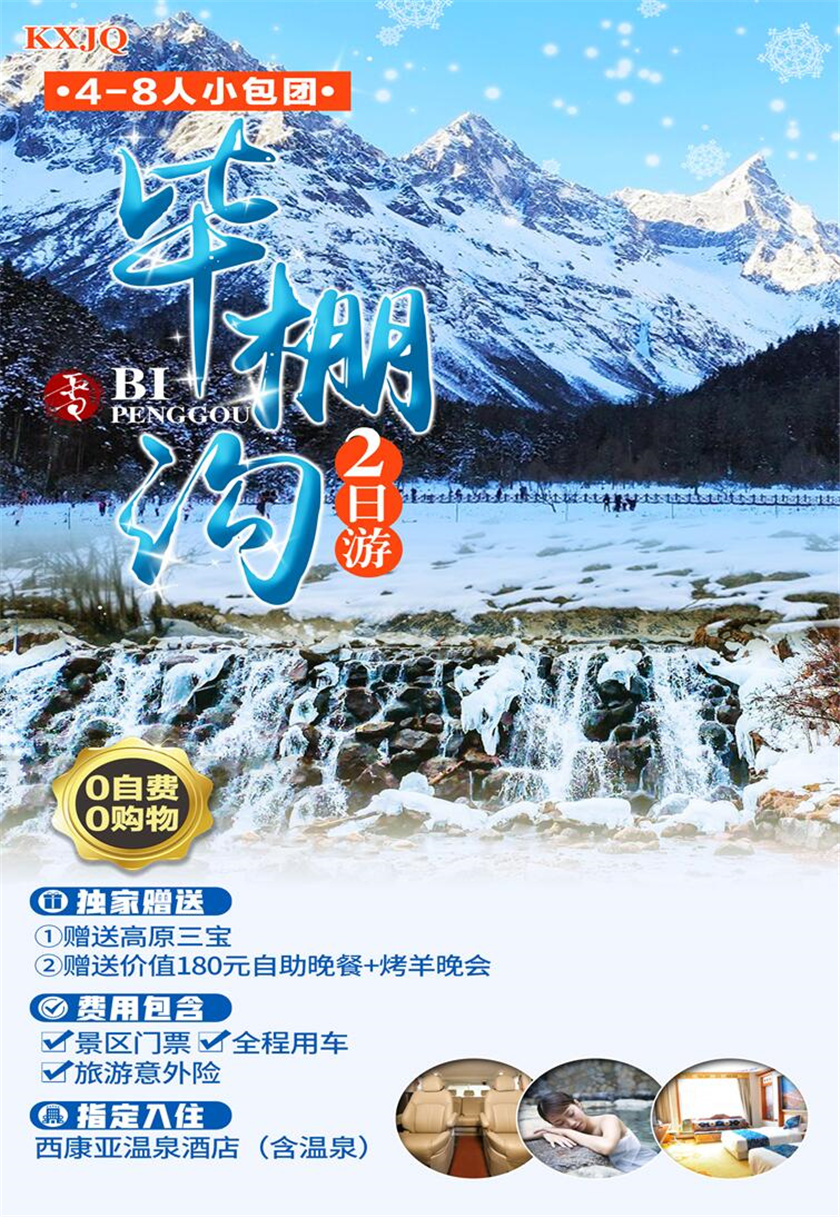 09:00游览毕棚沟风景区(景区观光车费用60元/人自理)。另游客可根据自身体力和身体情况自愿自理乘坐电瓶车游览:上海子接待中心—磐羊湖服务站20元/单程,磐羊湖—燕子岩窝20元/单程)。观沟内观原始森林、绚丽多彩的植被、满山遍野的踏青赏花(春季)、避暑消夏(夏季)、红叶登高(秋季)、雪山温泉(冬季)、梦幻海子、奇峰林立、湖水碧绿、瀑布飞挂、泉水幽幽,溪水潺潺,瀑布飞挂,林木葱葱,冰川覆盖的世外桃源美景,走茶马古道,穿越原始森林到达—卓玛湖、白龙瀑布,月亮湾、磐羊湖……也可以在滑雪场自由活动(堆雪人、打雪仗、雪碰碰车、滑雪、溜冰…项目自选,费用自理)