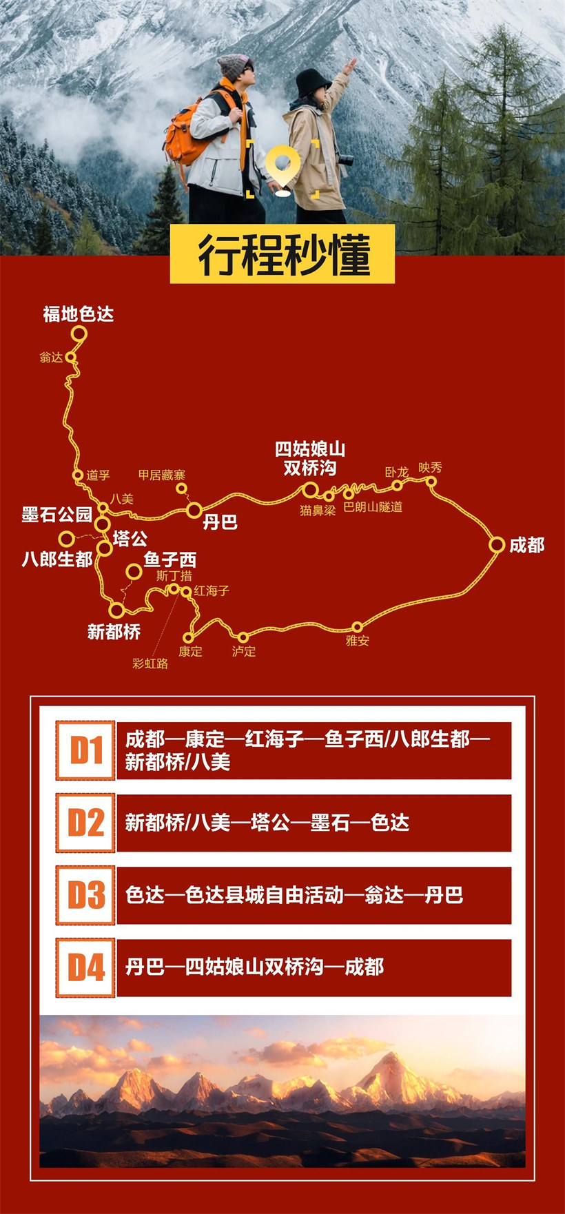 早上我们整装出发前往四姑娘山游览【双桥沟】(门票 80/人,观光车 70 元/人,费用 自理),观阴阳谷、人参果坪、沙 棘林栈道、盆景滩、撵鱼坝、四姑娜措、猎人峰、野 人峰、布达拉峰、红杉林等景点, 双桥沟 景区开阔平坦、景点集中,全程通车。沟内 以山景为主,沿沟 216 平方公里范围内,次第分布 着几十座海拔在 5000 米上的山 峰,会同山涧溪流,如同徐徐展开的山水画廊。沟内还分布着 目前国内罕见的千年原 始沙棘树林,以及平坦宽阔的高山草甸,夏季,各色花卉装簇其间,香 飘数里,漫步 其中,宛若置身仙境。沟内现已开通绿色环保的观光车,游客可以更加舒适、方便的游 览整个景区,浏览完景区后我们吹响返程的号角, 这一行四天,我们见证了佛学文化, 欣赏了自然风光,这一行让我们流连忘返