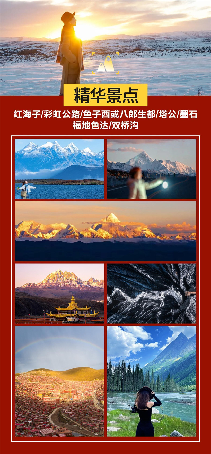 早上 集合出发,途径雨城雅安,一路风光秀丽我们前往【红海子】(垃圾处理费 15/人自 愿自理)位于四川康定折多山上的康定机场后,座落在木格措到塔公的新建旅游环线上。 海拔:4200 米左右,海子对面是笔架山雪峰。每当天气晴朗的下午,碧水蓝天,水面 如镜,雪峰映衬在湖中非常迷人,宛如仙境。夕阳西下,雪峰被染上金色,蔚为壮观。 这里是拍摄高山湖泊的理想之地,浏览完红海子后前往日落圣地——鱼子西,【鱼子西】 中转费(车费只核算到新都桥,原车摆渡也需收此费用 60 元/人,垃圾费 330 元/人 自费自理(四月起鱼子西垃圾费增长为 30/人))【鱼子西】属于木雅贡嘎地区,拥有 以藏传佛教为基础的基本文化特征,项目范围内可 360 度遥望藏区四大神山之一藏区 “第二香巴拉”的雅拉神山全貌和四川最高峰“蜀山之王”的木雅贡嘎大雪山山系全貌, 为贡嘎西坡地区难得的观景摄影点。而后前往八美入住休息