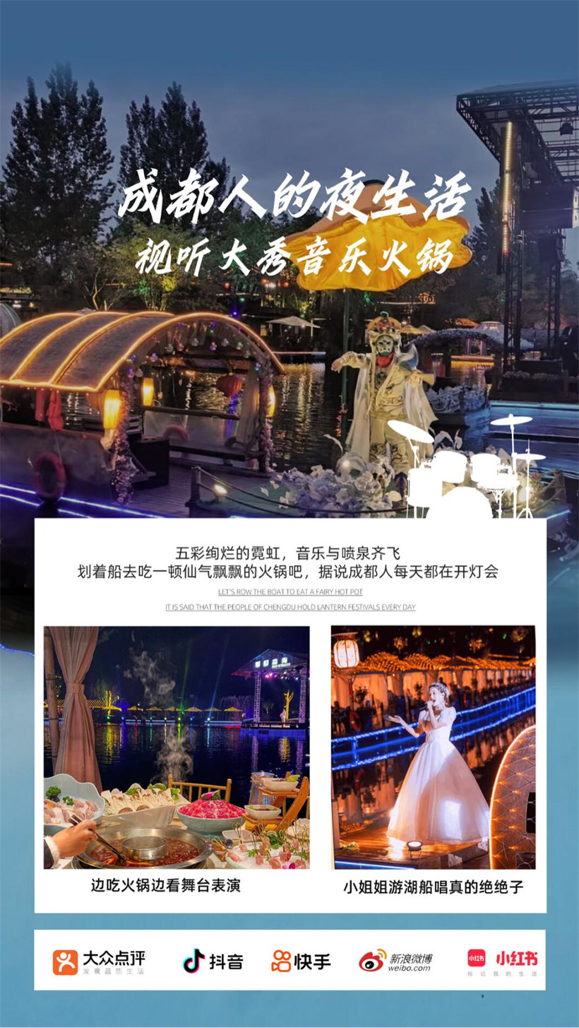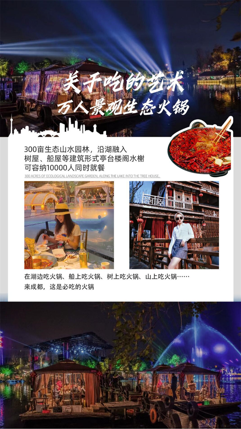 【玛歌庄园】300亩生态山水园林,亭台楼阁水榭,沿湖融入树屋、船屋等建筑形式,可容纳10000人同时就餐。在湖边吃火锅、船上吃火锅、树上吃火锅、山上吃火锅……来成都,这是必吃的火锅。五彩绚烂的霓虹,音乐与喷泉齐飞,划着船去吃一顿仙气飘飘的火锅吧,据说成都人每天都在开灯会
