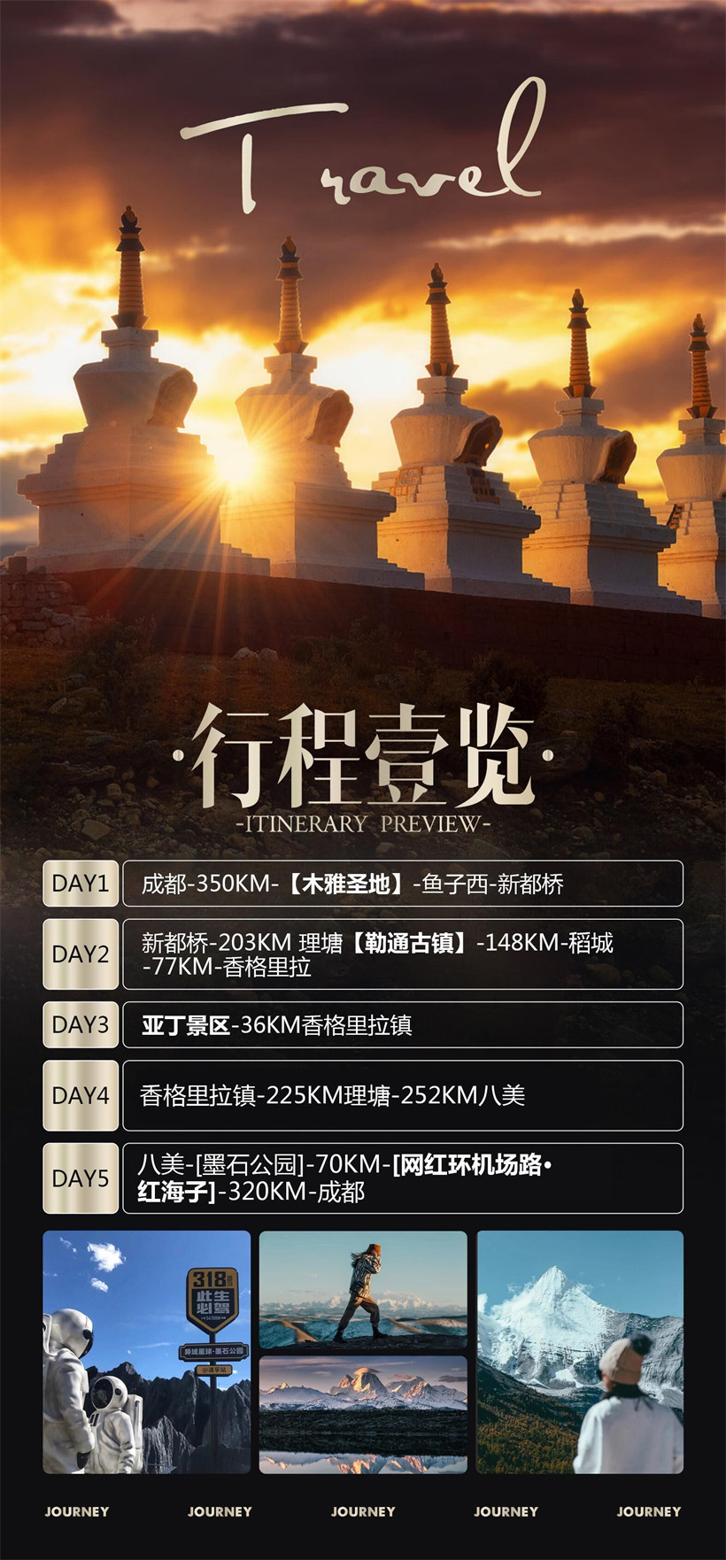 早起后用完早餐,离开新都桥后欣赏沿途秀美的景色翻越海拔(4412米)的高尔寺山,如果天气 晴朗,则有幸在山顶一睹蜀山之王•贡嘎山的风采(四川高峰,海拔7556米)。经雅江县穿越剪子 弯山隧道(全长2230米),抵达【卡子拉山】(海拔4718米),来到有着世界高城之称的理塘。(海 拔4000米)观【毛垭大草原】风光,给你一种想策马奔腾的感觉。感受了辽阔的大草原后参观【仁 康古街】仁康古街历史悠久,火山石铺路面,街道两旁错落有致的分布着藏族特色建筑群,好多建 筑外墙上建有佛手,是一条很有民族文化特色的古街,也是体验藏族文化的好地方。翻越传说中龟 兔赛跑—【兔子山】。远观就像兔子的耳朵特别的可爱。之后我们即将翻越壮观的青藏 高原、古冰 体遗址、稻城古冰帽-海子山自然保护区海拔(4500米),海子山是由1145个大小海子和嶙峋怪石 组成。犹如上帝失手撒下的一千颗钻石一般烁 在山间,典型的古冰帽遗迹。让人感慨大自然的鬼斧 神工。之后将沿途欣赏赤土河谷迷人风光、世外桃源般藏式村寨,经桑堆(稍作休息进入高原服务 站由当地医务人员讲解高原地区注意事项)稻城尊胜白塔后,抵达最后的香巴拉——【稻城】。沿 途欣赏万亩白杨林,翻越海拔4300多米的【波瓦山】,赤土河谷迷人风光、世外桃源般藏式村落定 会令你流连其中,抵达今天的目的地香格里拉镇