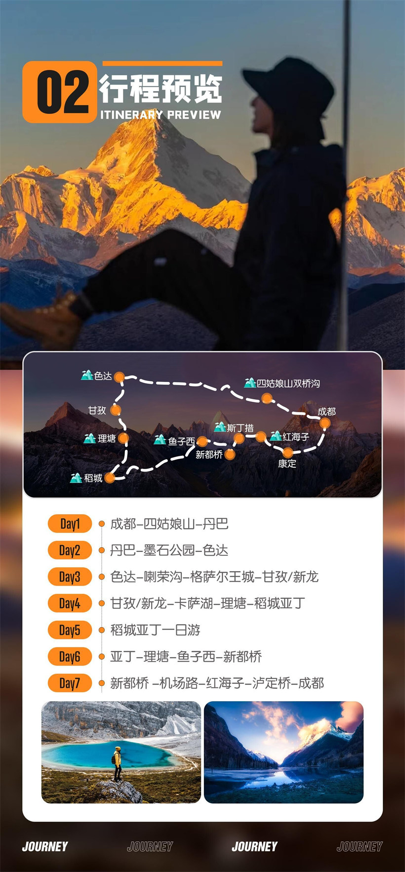 早上早起,一路走新都桥大美公路———网红机场路,在这里我们打卡拍照,彩虹 公路加上完美雪山,这里随手都能出大片,后一路前往【红海子】(垃圾处理费 10/ 人自愿自理)位于四川康定折多山上的康定机场后,座落在木格措到塔公的新建旅游 环线上。海拔:4200 米左右,海子对面是笔架山雪峰。每当天气晴朗的下午,碧 水蓝天,水面如镜,雪峰映衬在湖中非常迷人,宛如仙境。夕阳西下,雪峰被染上 金色,蔚为壮观。这里是拍摄高山湖泊的理想之地,浏览完红海子后,经康定前往 革命前辈经过的地方—泸定桥游玩(上桥费 10 元/人,自理),之后一路驱车返回 成都,结束愉快的旅程!