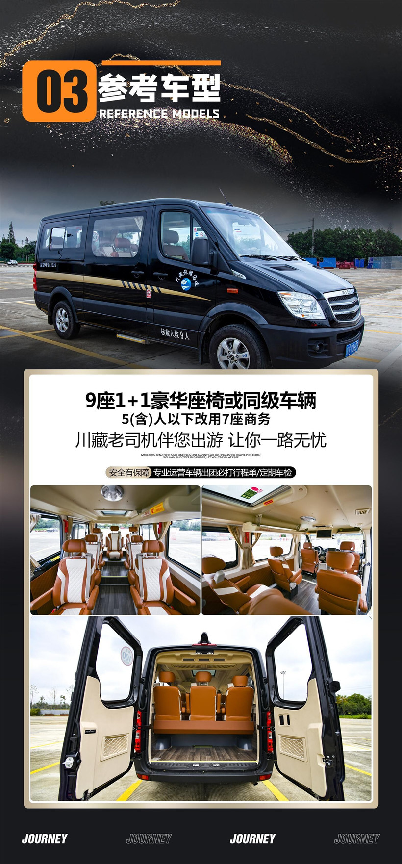 地面交通:17 座 1+1 豪华保姆车(8 人及以下安排 9 座 1+1 保姆车)。